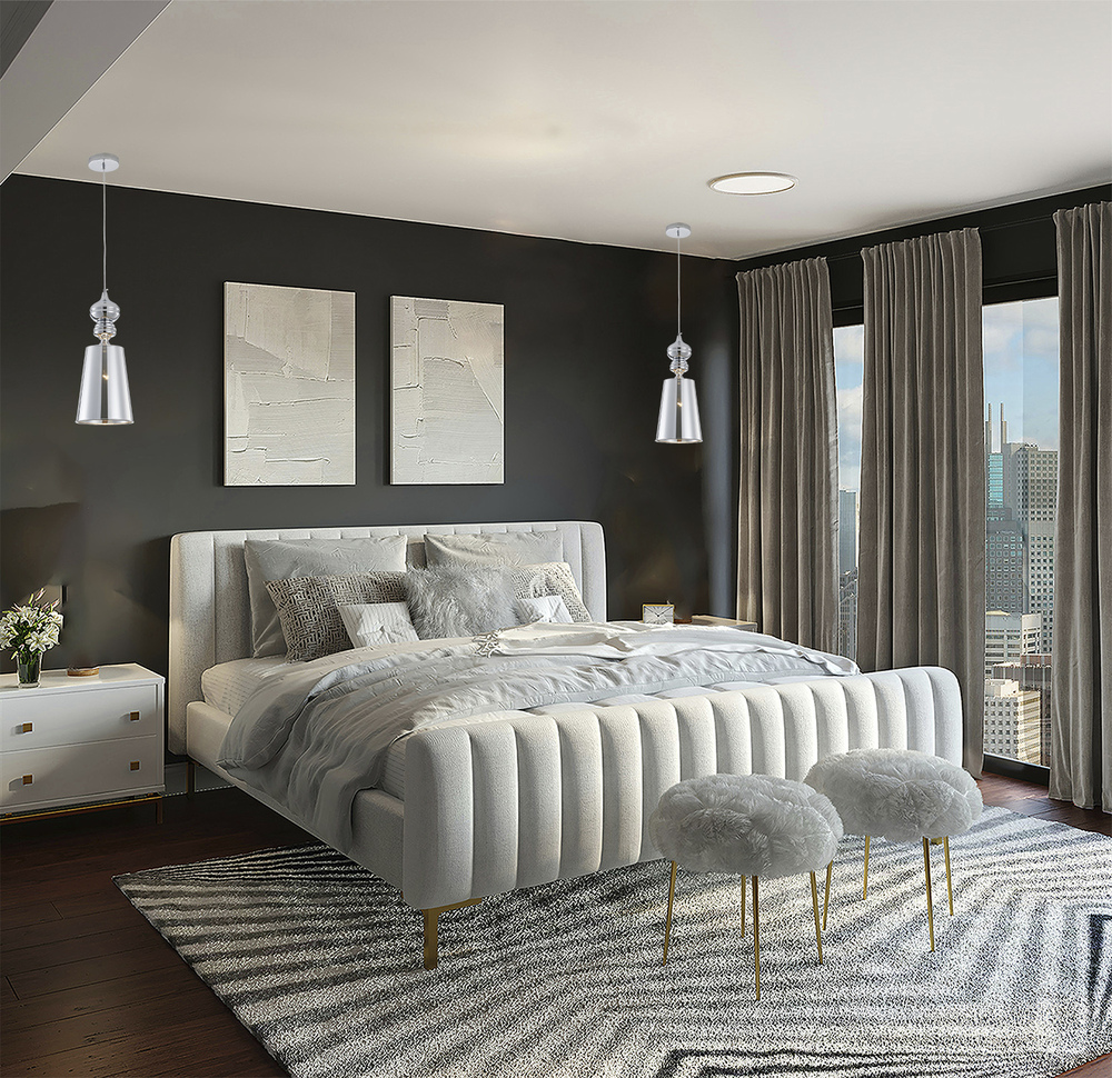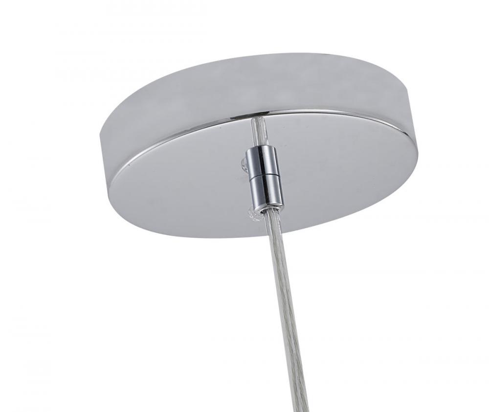 This single pendant light is in a polished chrome finish. The frame is made out of metal, and it comes with polished chrome shade. The adjustable cord link makes this fixture suitable for most ceiling heights