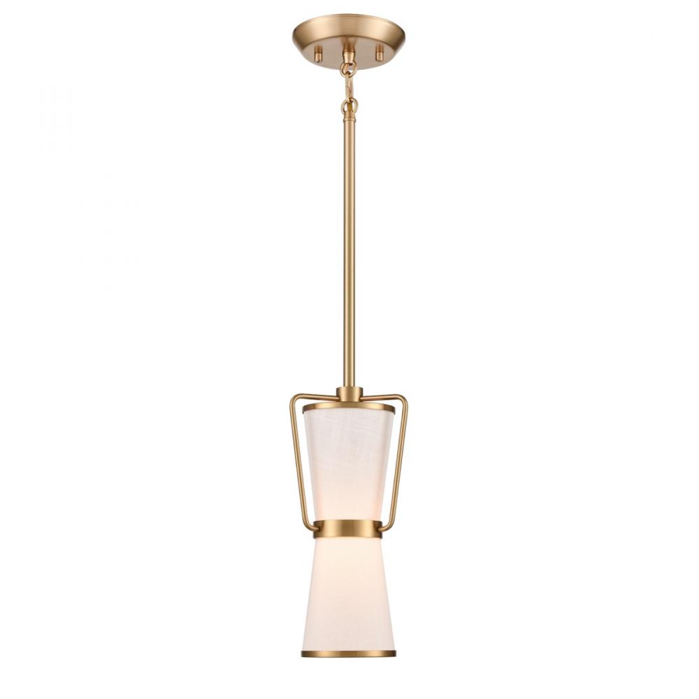 The Layla collection, designed by Kevin Kraemer, features a rich plated brushed brass finished frame, which holds the double linen shades in a unique fashion. This model is a single pendant which comes with extra rods for height adjustment and compatible with sloped ceilings.