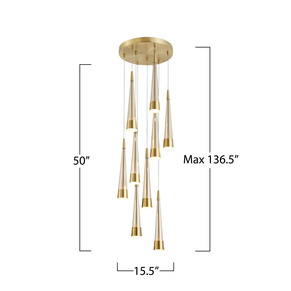 The Sunnyvale collection boasts a distinctive cone-shaped design adorned with metalwork on both the top and bottom, enveloping a captivating tea stain tinted center glass complimented with brushed brass framing. The pendant's exquisite craftsmanship and attention to detail result in a contemporary yet elegant aesthetic, making it a standout piece in any interior. With LED illumination seamlessly integrated throughout the glassware, the Sunnyvale collection not only delivers striking visual appeal but also provides efficient and ambient lighting. 9 light foyer model shown. (easily height adjustable)