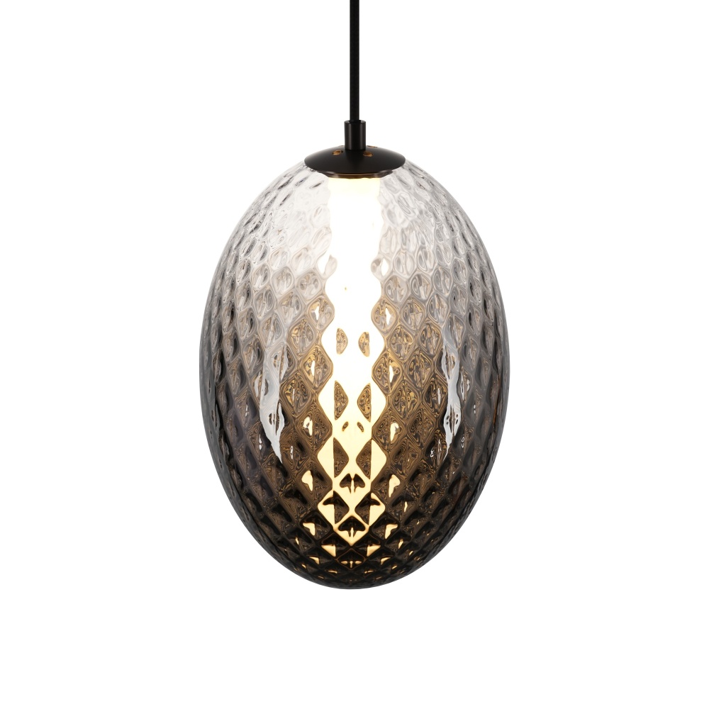 The LED pendant from the Celeste collection is a symphony of sophistication, featuring a mesmerizing diamond-patterned ombre smoke glass that gracefully encases an illuminated inner white tube. Its gunmetal-finished metalwork adds a rich, modern allure, making it a standout centerpiece for any room. A clever peek-hole design at the bottom casts a focused beam of light downward, while the ambient glow from the sides creates a warm and inviting atmosphere. This elegant fixture is a harmonious blend of form and function, perfect for elevating your space with timeless charm. The textile wire cover is designed for elegance and ease height adjustment.