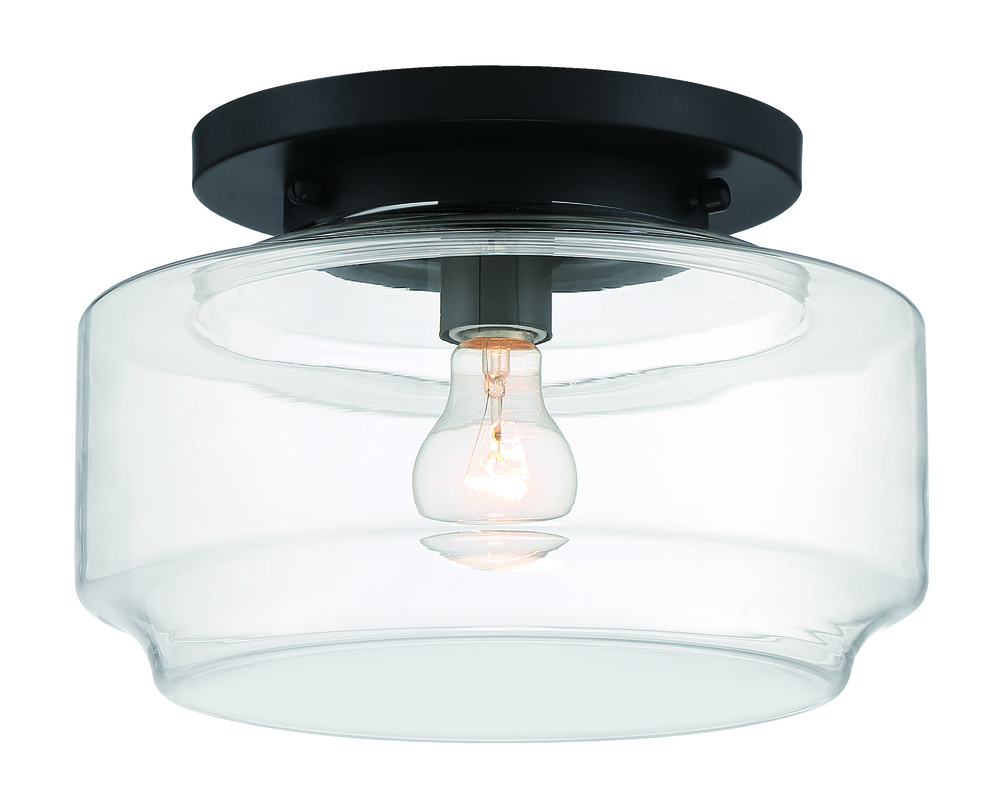The Peri Collection , inspired by classic schoolhouse lights, features a wide clear glass globe in a familiar yet updated shape. Finished in your choice of brushed polished nickel, flat black or satin brass, these flushmounts are available in 12" and 14" diameter and each uses a single 60W medium base bulb.
