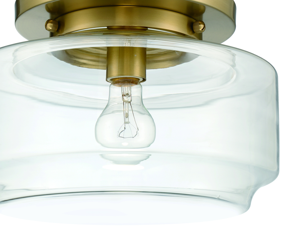 The Peri Collection , inspired by classic schoolhouse lights, features a wide clear glass globe in a familiar yet updated shape. Finished in your choice of brushed polished nickel, flat black or satin brass, these flushmounts are available in 12" and 14" diameter and each uses a single 60W medium base bulb.