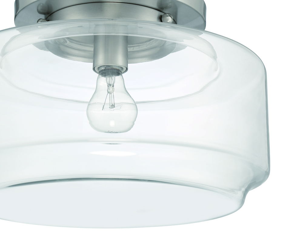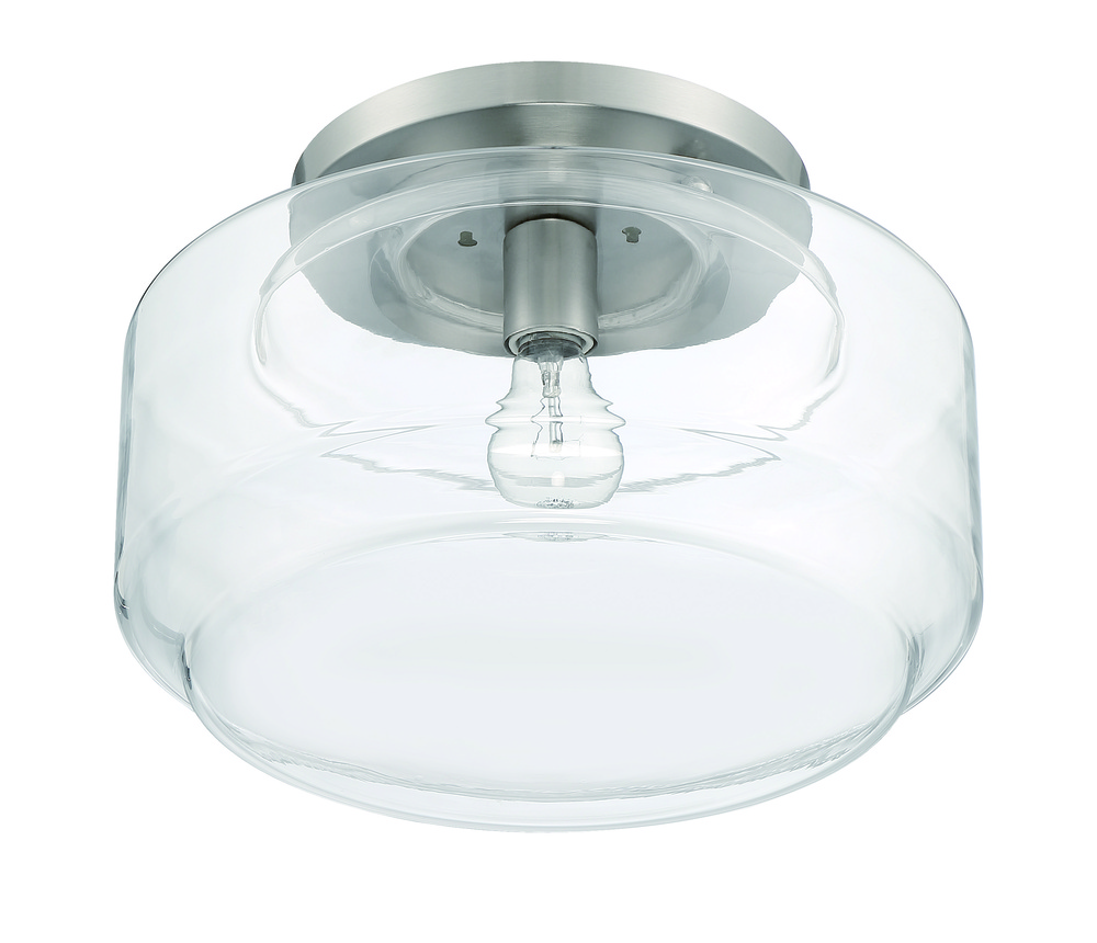 The Peri Collection , inspired by classic schoolhouse lights, features a wide clear glass globe in a familiar yet updated shape. Finished in your choice of brushed polished nickel, flat black or satin brass, these flushmounts are available in 12" and 14" diameter and each uses a single 60W medium base bulb.