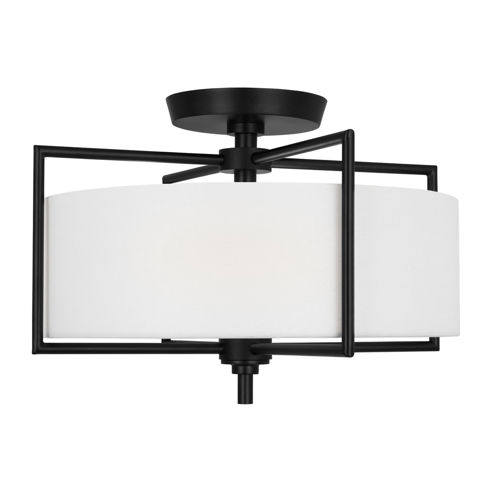 The Perno two-light flush mount in Aged Iron by Chapman and Myers was inspired by a vintage mid-century French sconce with a simple metal armature. The minimal cruciform structure of the metal frame is the main feature of the design. The frame outlines and supports the inner cylindrical shade. All of the assembly hardware for installing the inner shade was engineered to be hidden in order to maintain the clean and simple aesthetic of the light.