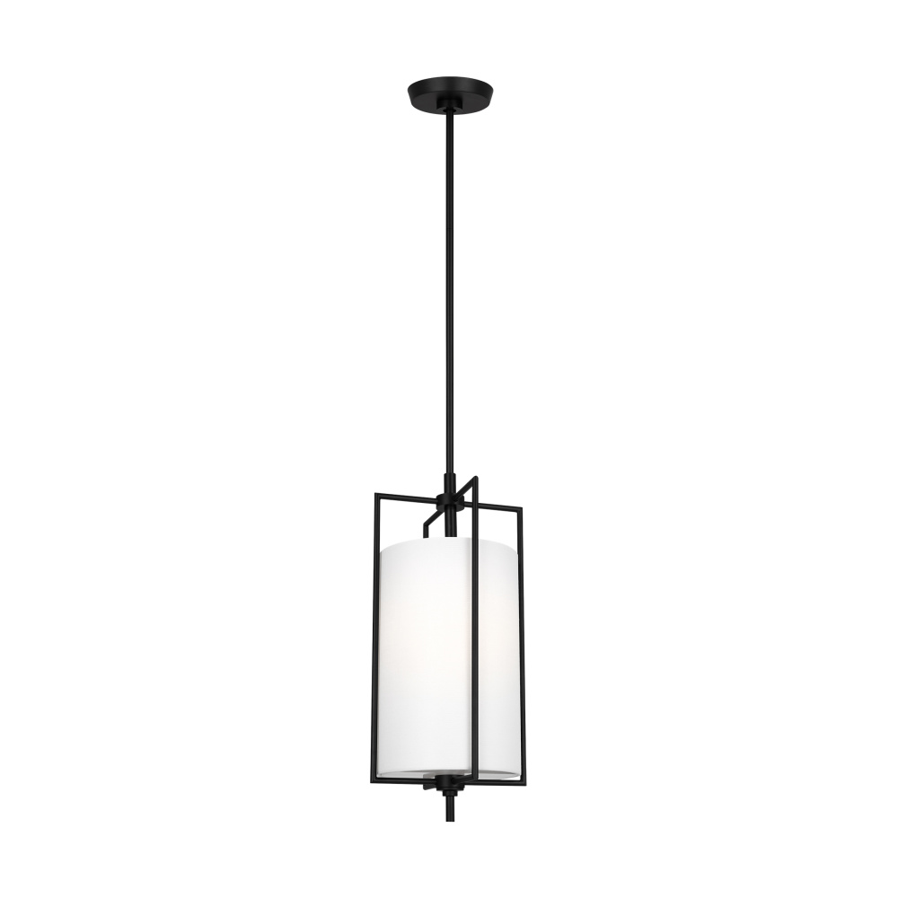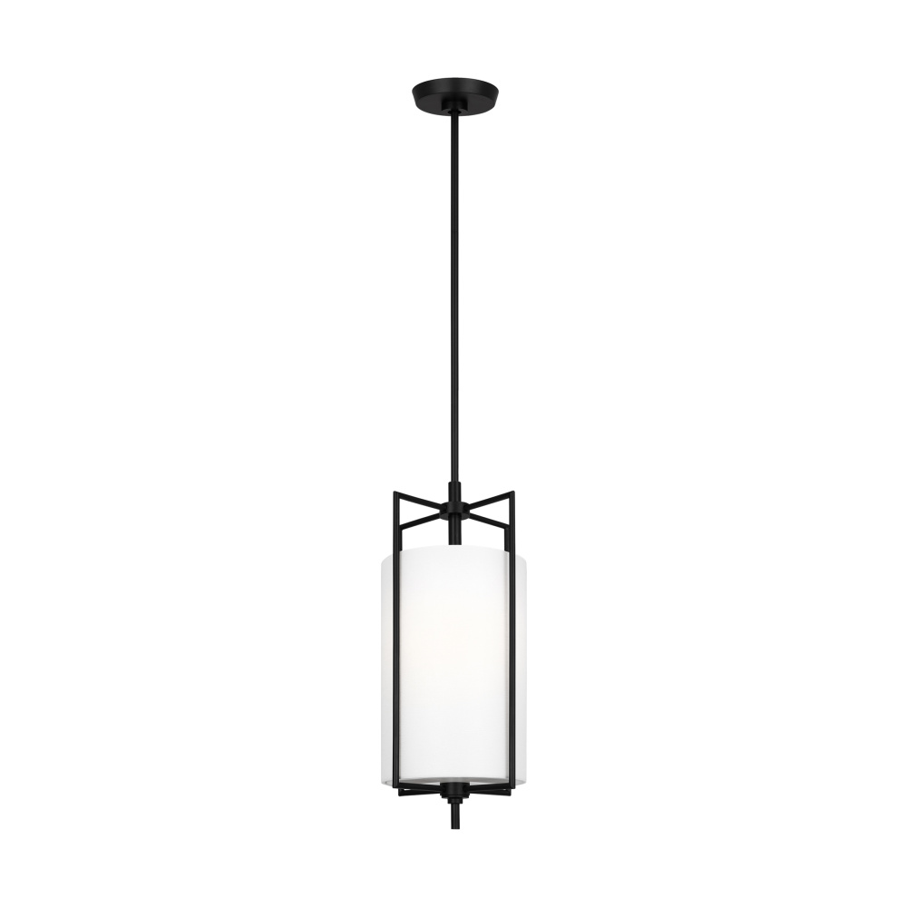 The Perno one-light shade pendant in Aged Iron by Chapman and Myers was inspired by a vintage mid-century French sconce with a simple metal armature. The minimal cruciform structure of the metal frame is the main feature of the design. The frame outlines and supports the inner cylindrical shade. All of the assembly hardware for installing the inner shade was engineered to be hidden in order to maintain the clean and simple aesthetic of the light.