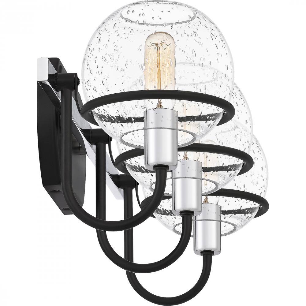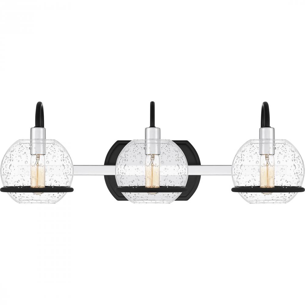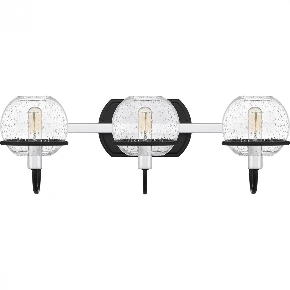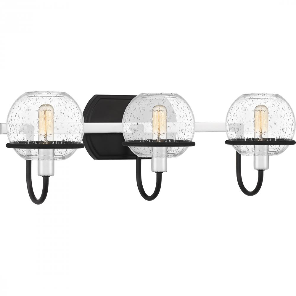 Phoenix radiates charm with its clear seeded glass globes and transitional style detailing. A simple silhouette, clean lines, and mixed metal accents give these bath vanity lights a unique and industrial feel. Choose from two, three or four lights in eithe