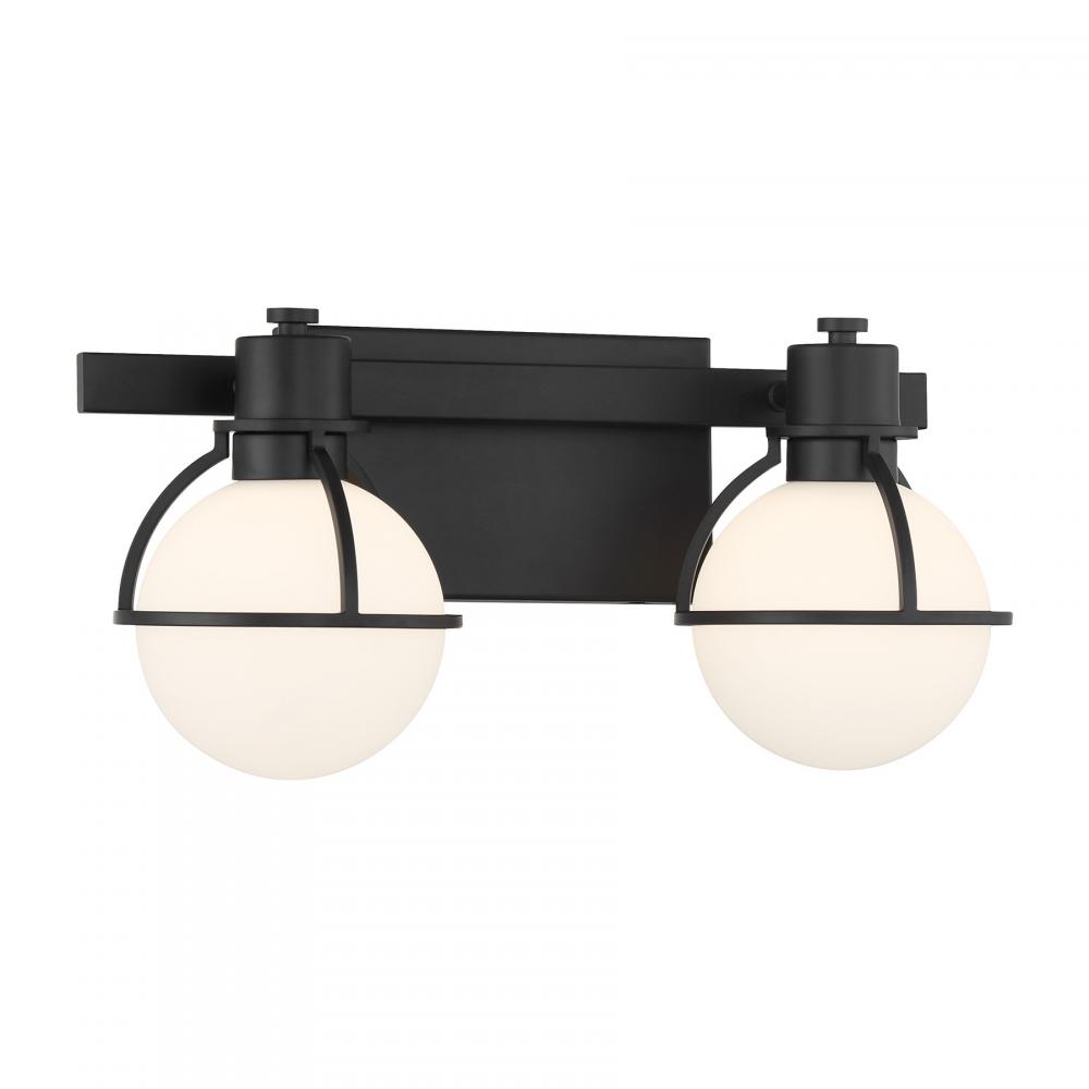 The Savoy House Pierce 2-light bath light offers up a retro, factory-inspired style that makes it an excellent choice for stylish bathroom lighting. Slender, curving half-cages finished in Black securely hold orbs of white opal glass that will provide a bright and welcoming glow. Pierce is 7.5" in height, 15.5" in width and extends 7" from the wall. Uses two G9 style bulbs of up to 60 watts per bulb. Bulbs not included. Install as shown. This bath bar is damp area rated.