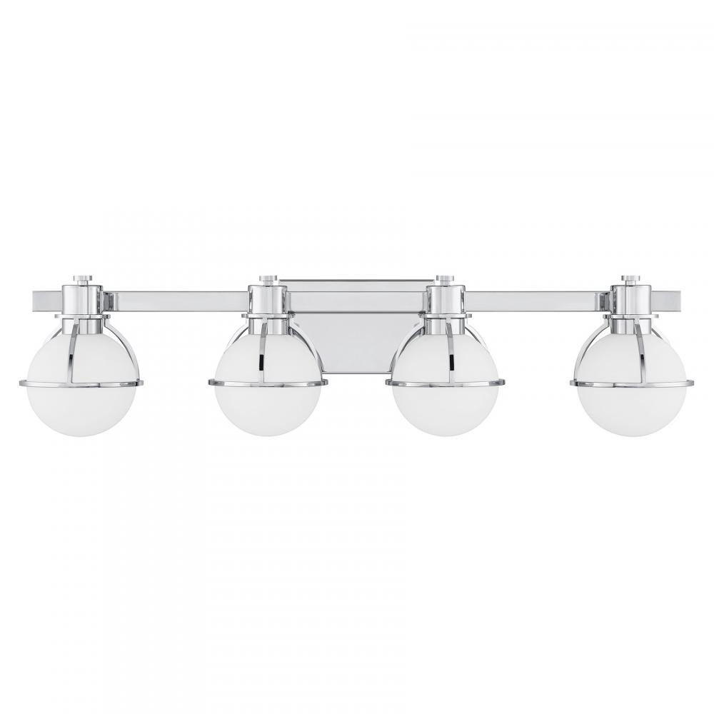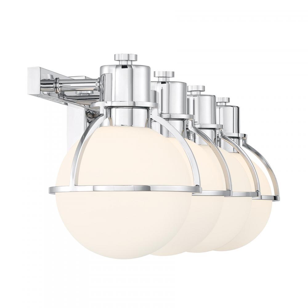 The Savoy House Pierce 4-light bath light offers up a retro, factory-inspired style that makes it an excellent choice for stylish bathroom lighting. Slender, curving half-cages finished in Chrome securely hold orbs of white opal glass that will provide a bright and welcoming glow. Pierce is 7.5" in height, 32" in width and extends 7" from the wall. Uses four G9 style bulbs of up to 60 watts per bulb. Bulbs not included. Install as shown. This bath bar is damp area rated.