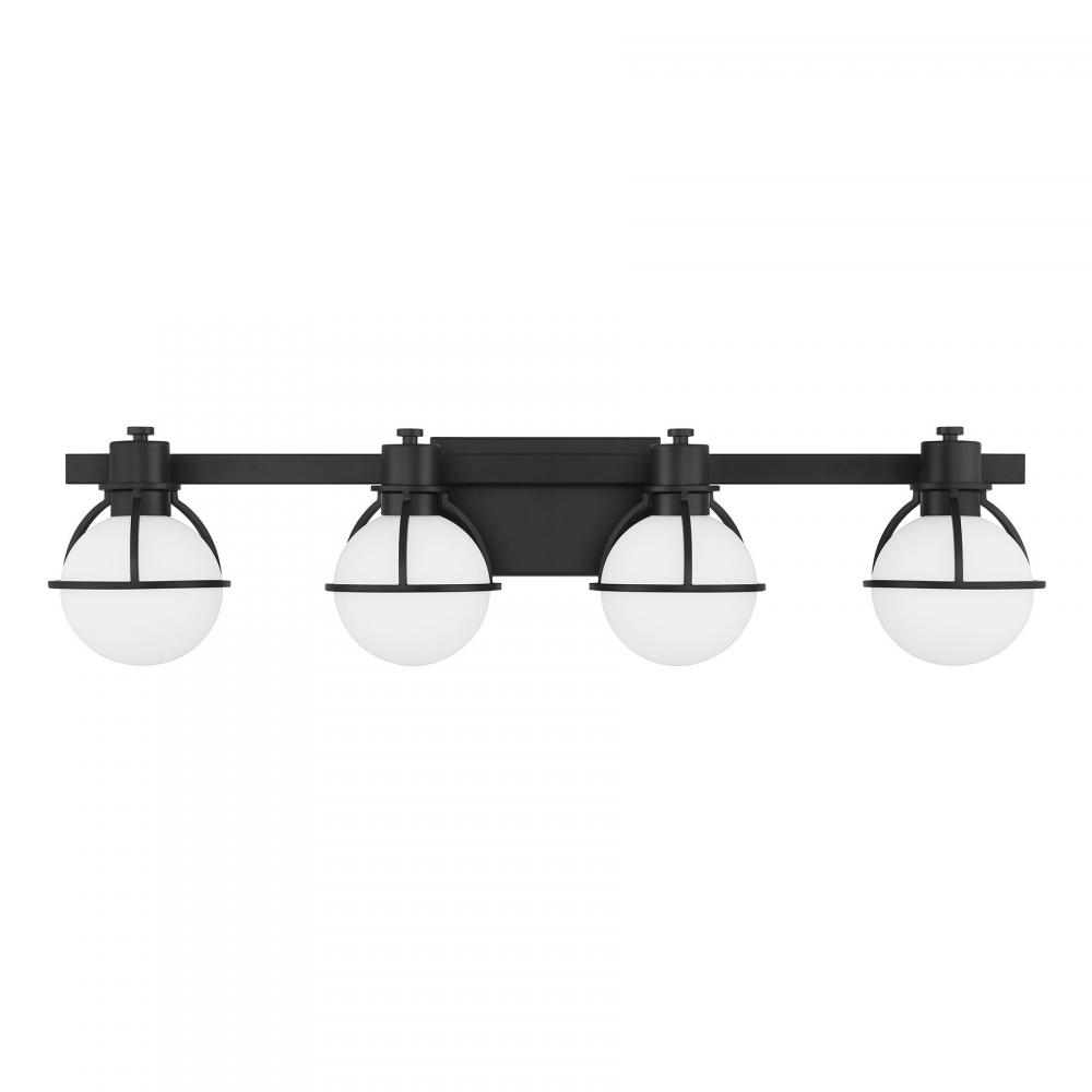 The Savoy House Pierce 4-light bath light offers up a retro, factory-inspired style that makes it an excellent choice for stylish bathroom lighting. Slender, curving half-cages finished in Black securely hold orbs of white opal glass that will provide a bright and welcoming glow. Pierce is 7.5" in height, 32" in width and extends 7" from the wall. Uses four G9 style bulbs of up to 60 watts per bulb. Bulbs not included. Install as shown. This bath bar is damp area rated.