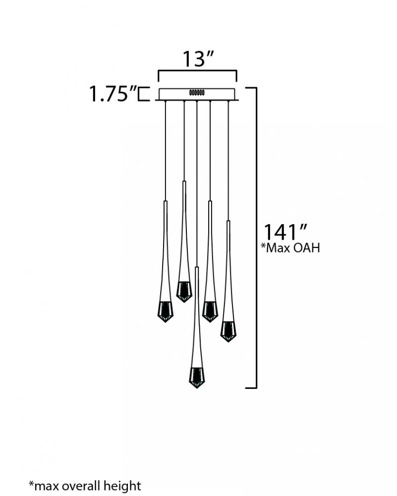 An elongated profile with piercing statement, this series of pendants feature thin black wires that support a tapered metal pendant. Recessed in this form is a high powered LED that illuminates a brilliantly faceted crystal element with etched details insi