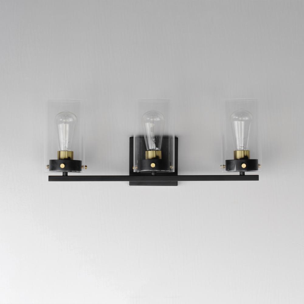 Simple clear glass cylinders are secured by decorative thumb screws in this transitional collection of sconces and pendants both neutral in design and suitable for damp applications. Choose from Satin Nickel or a two-tone Black and Satin Brass finish to pa