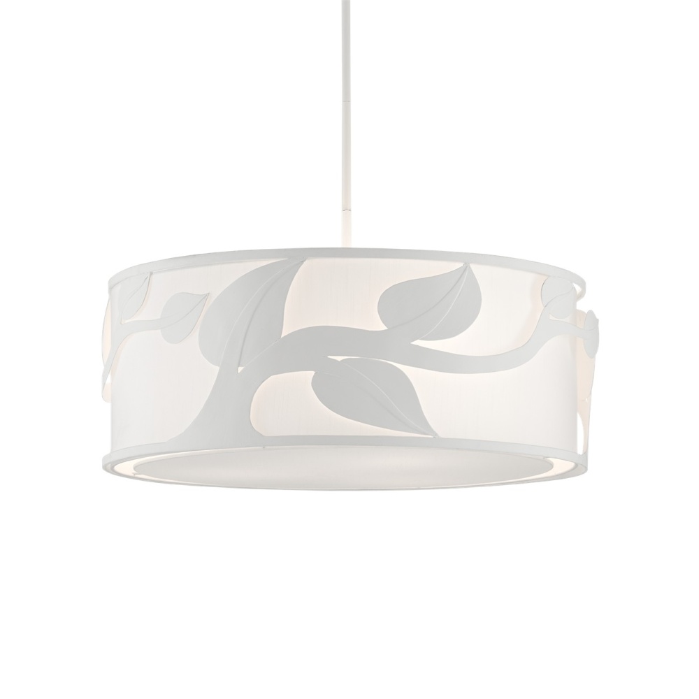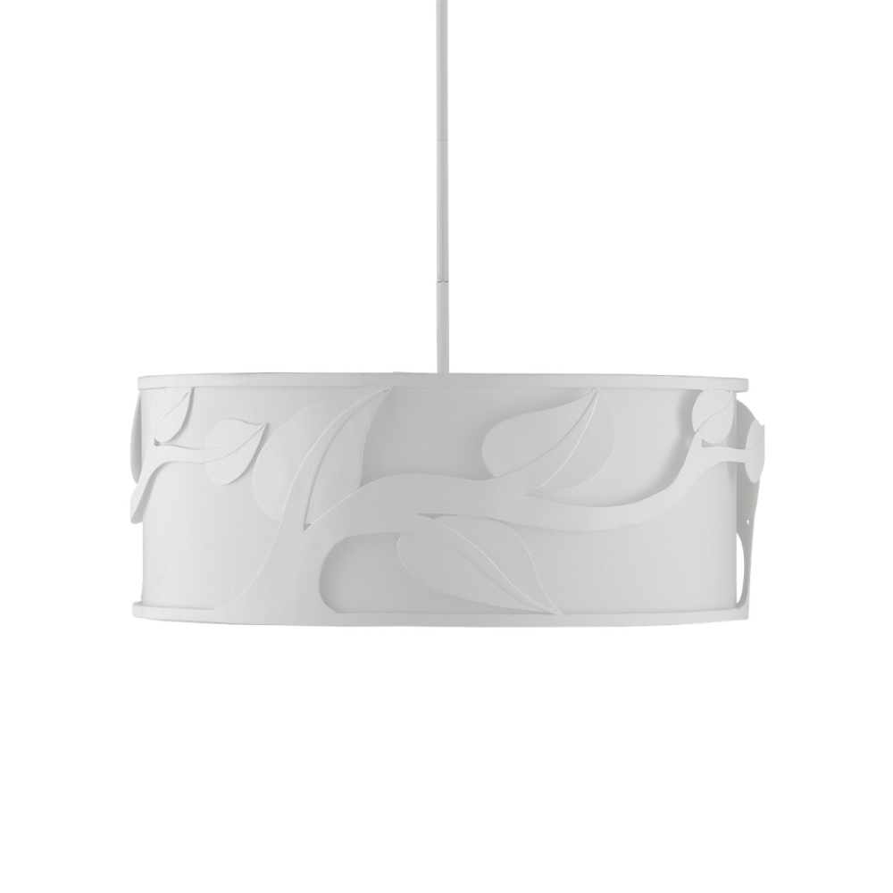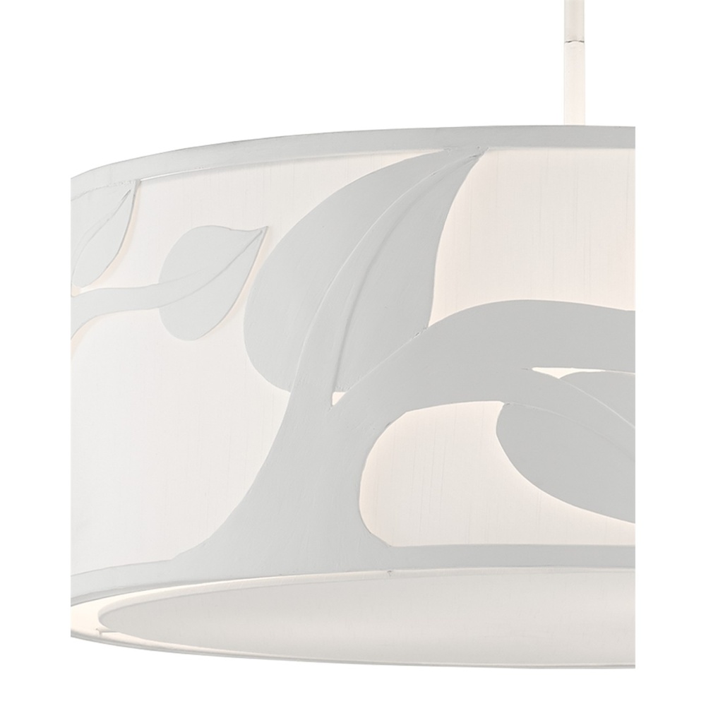 The Plumeria Drum Chandelier was inspired by a perfume bottle by Lalique. The pattern that runs along the exterior of the shade of this white chandelier is made of laser-cut steel finished in hand-applied white gesso. The cutting of the metal involves significant engineering skills to pull off the symmetry and balance. Adjustable from 17.5" to 59.5" with use of included chain/rod kit/cable. If your space calls for a longer drop, additional chain/rods/cable is available for purchase.