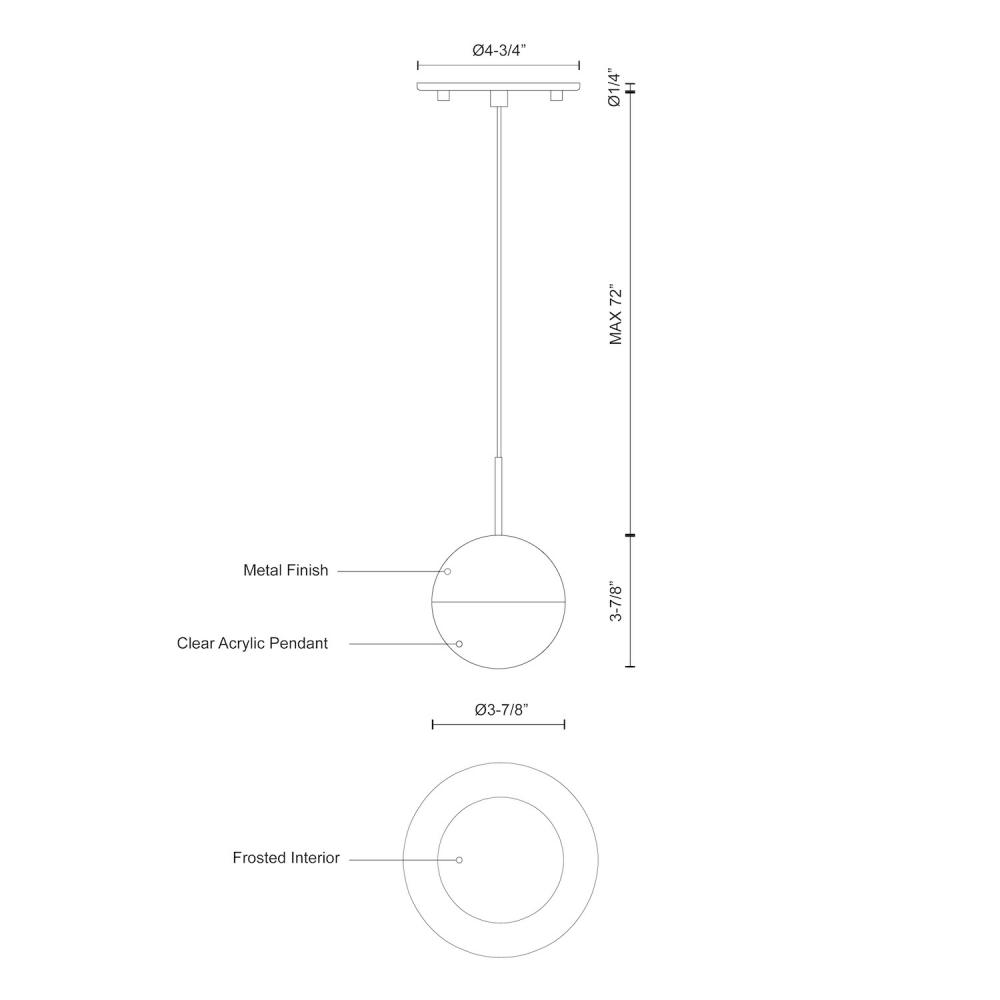 A timeless spherical geometry is inherent to the Pluto pendant. A split line at the globe equator separates complementary plated LED housing from translucent acrylic diffuser. The multiple color options make the fixture a perfect furnishing accent or, in multiples, a focal point.
