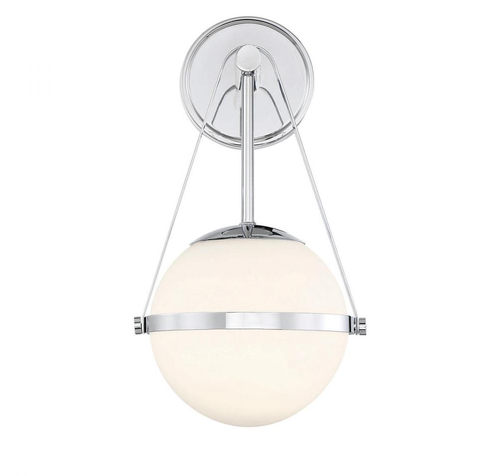 This Savoy House Polson 1-light wall sconce showcases a chic take on midcentury modern style inspiration. Its opal etched glass orb is held in place by a slender rod as well as a central band and metal strap around the arm. Finished in polished chrome. Polson is 15.5" in height, 8" in width and extends 8" from the wall. It uses one standard size bulb of up to 60 watts. Damp area rated.