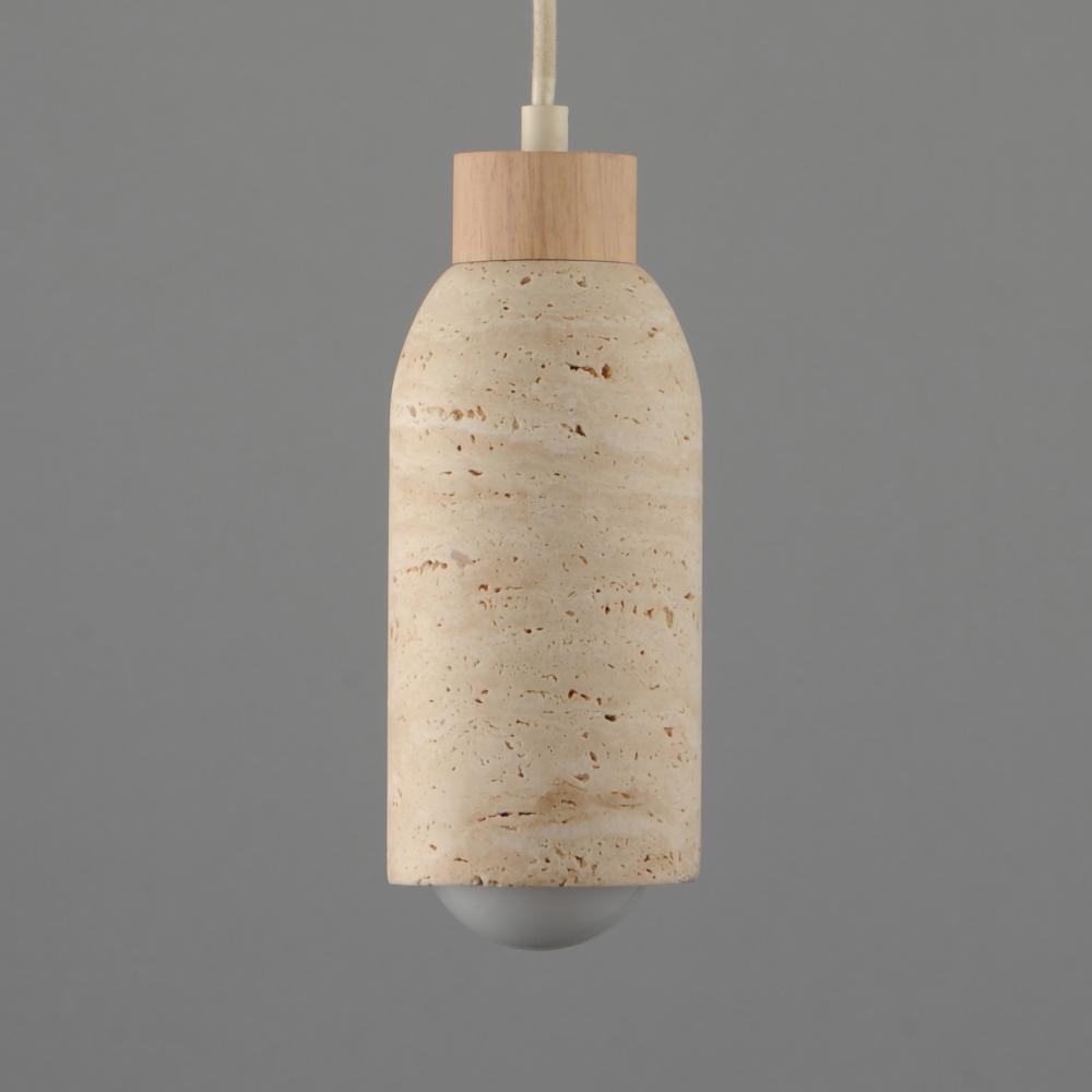A tribute of natural materials, this collection features carved stone shades in your choice of Travertine or volcanic Lava Rock, paired with coordinating lathed wood bases. The Travertine composition showcases White Oak wood and Ecru white metal accents, w