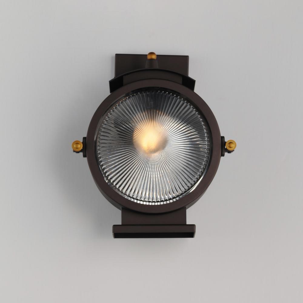 This nautical design features a solid dome of aluminum finished in Oil Rubbed Bronze with solid brass hardware finished in Antique Brass. The Clear prismatic glass diffuser completes the authentic look of this outdoor collection.