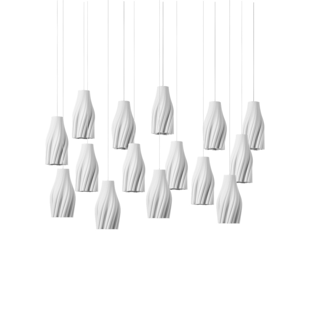 The Posh 15-Light Linear Multi-Drop Pendant has shades made of white ceramic crafted to resemble tassels. The sense of movement created by the material is an artisanal touch that brings the shades a lovely graceful quality. The thin silver cables from which they hangs leave the shades themselves to be the star of the design.