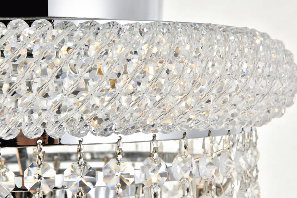 Primo flush-mount fixtures come in finishes of brilliant chrome or gold, which are refracted in the clear crystals