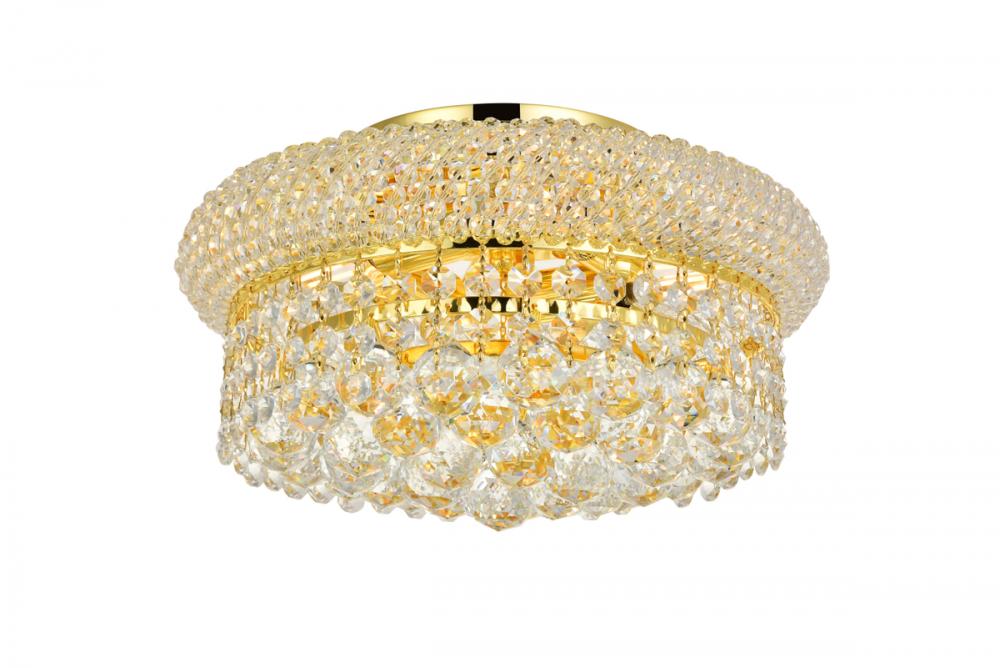 Primo flush-mount fixtures come in finishes of brilliant chrome or gold, which are refracted in the clear crystals