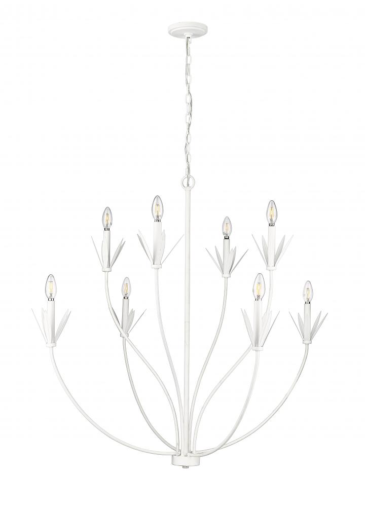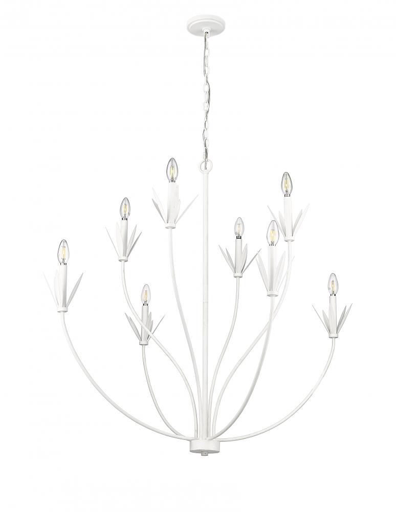 The Primrose Collection is defined by chic, linear leaf-shaped flourishes punctuating the fount and candle cups of these chandeliers. The sweeping, gentle curves and modern take on a botanic profile create a joyous effect for any gathering room from farmhouse to penthouse. The fixtures are available in either matte black or textured white with 6-light and 8-light options.