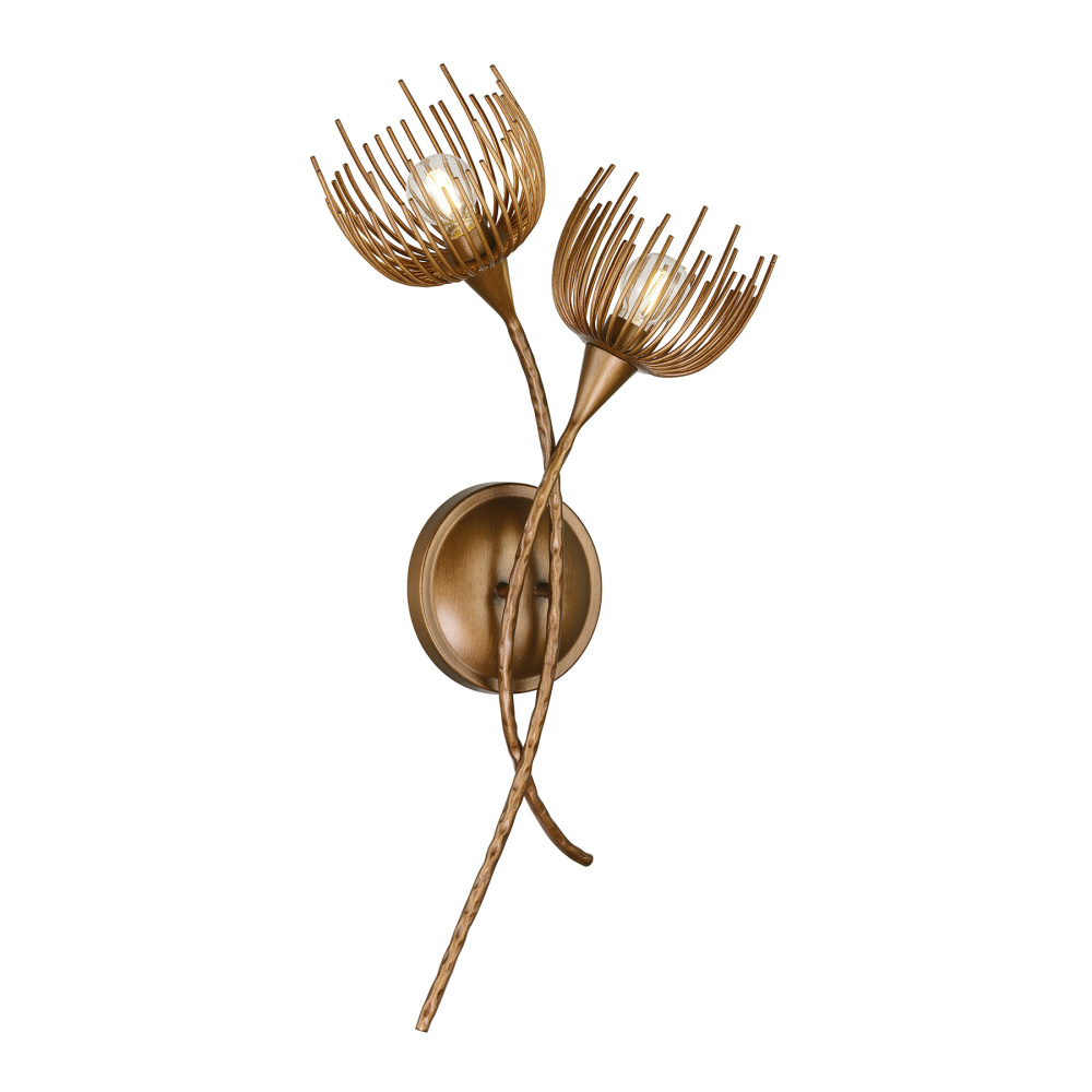 The Savoy House Protea 2-light sconce was designed by award-winning interior designer and TV host Breegan Jane. It is named for a beautiful African flowering plant that is also known as the sugarbush. The sugarbush has a distinctive shape that is portrayed here with gently curving hammered arms topped by delicate blossoms, all finished in a rich bronze Manchester finish hand-painted by artisans. Protea is 27.25" in height, 13.38" in width and extends 6.5" from the wall. It uses two candelabra size bulbs of up to 60 watts per bulb. Bulbs not included. This sconce is damp area rated.