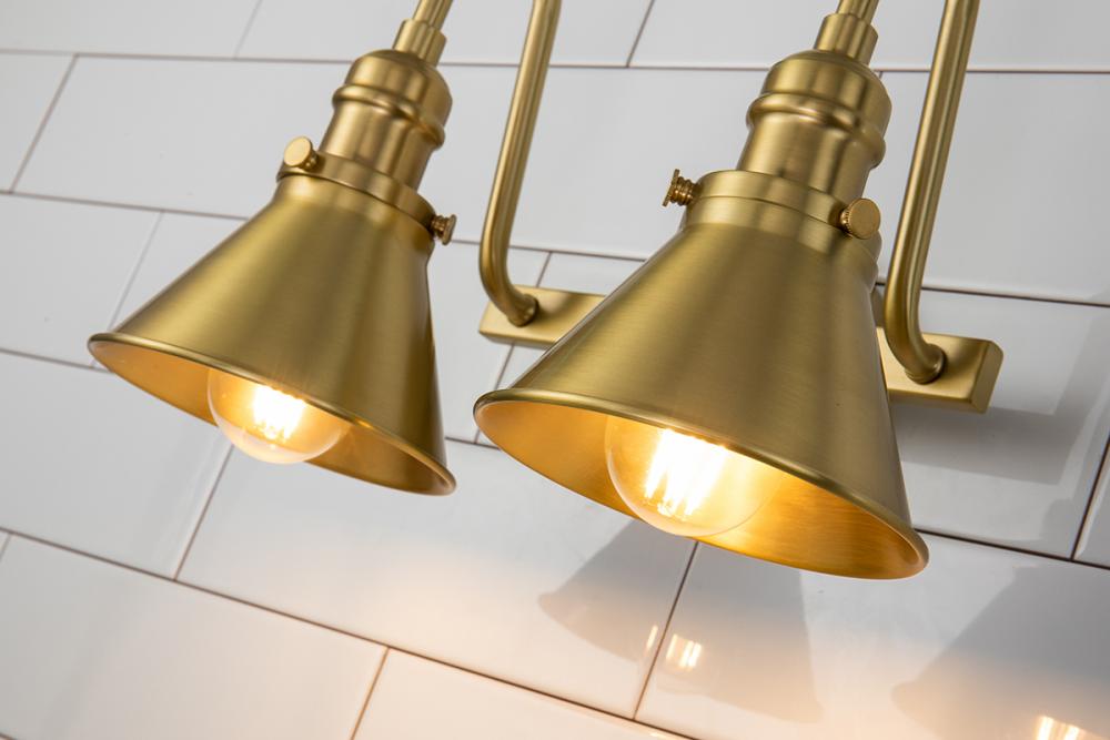A 2-light aged brass vanity with a high arched arm and cone shades. Its modern farmhouse style suits damp spaces, ideal over mirrors with vintage charm.