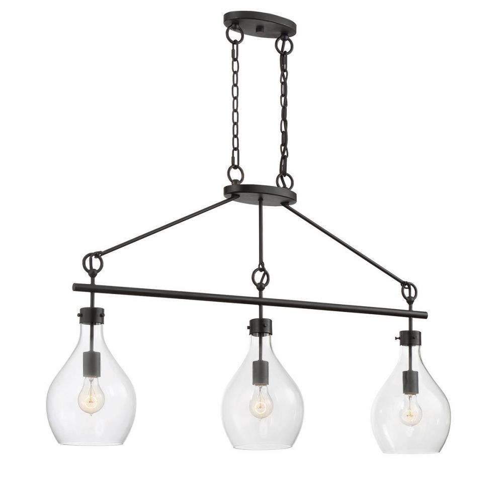 Bold lines and graceful curves create the understated design of this Pulaski chandelier. A sleek disc-shaped canopy has ring fittings that suspend a straight horizontal bar with three glass shades attached. The frame has a rich, oiled bronze finish, and the three shades are lovely, large bulbous, bottle shapes, made of pristine, clear glass. Three 60W, E-style bulbs provide excellent illumination through the clear glass —using Edison or visible filament bulbs will add even more character and charm. This chandelier has a linear shape: 42” long, 8” wide, and 26” high that’s perfect for classic style in your dining room, kitchen island, living room, family room, hallway, bar, great room, office, or gaming room.