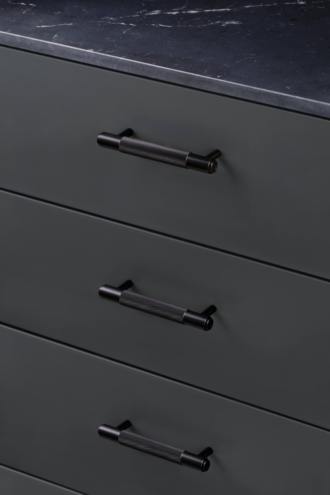 A pull bar made from solid black anodised metal. This pull bar features our signature, diamond-cut, cross-knurl pattern and is refined by hand. They work great on cabinet doors, wardrobe drawers, cupboards, kitchen units and just about anything that can open.