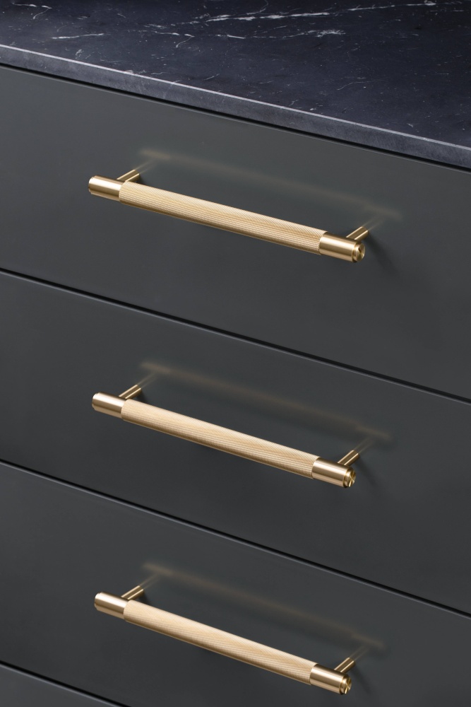 A pull bar made from solid brass. This pull bar features our signature, diamond-cut, cross-knurl pattern and is refined by hand. They work great on cabinet doors, wardrobe drawers, cupboards, kitchen units and just about anything that can open.