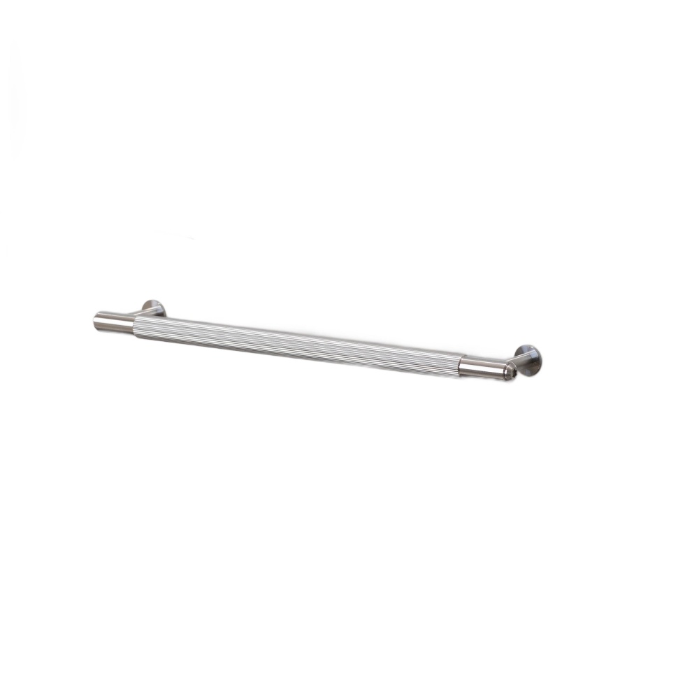 A pull bar made from solid stainless steel. This pull bar features our signature, diamond-cut, linear-knurl pattern and is refined by hand. They work great on cabinet doors, wardrobe drawers, cupboards, kitchen units and just about anything that can open.