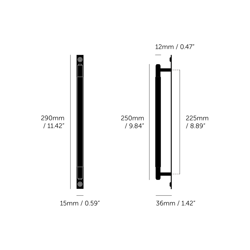 A pull bar made from solid anodised black metal. This pull bar features our signature, diamond-cut, linear-knurl pattern and is refined by hand. The pull bar includes a rectangular backplate made from solid black metal and finished with black metal torx screws. They work great on cabinet doors, wardrobe drawers, cupboards, kitchen units and just about anything that can open.