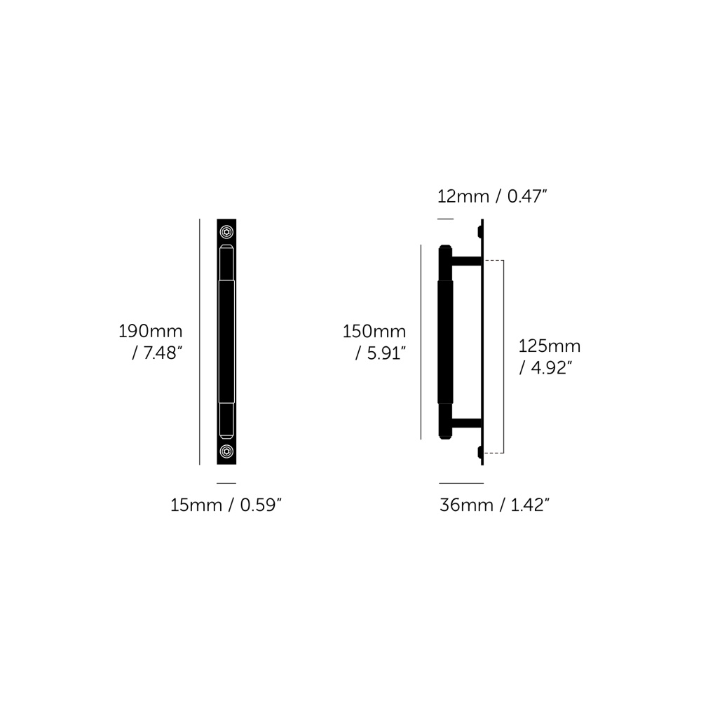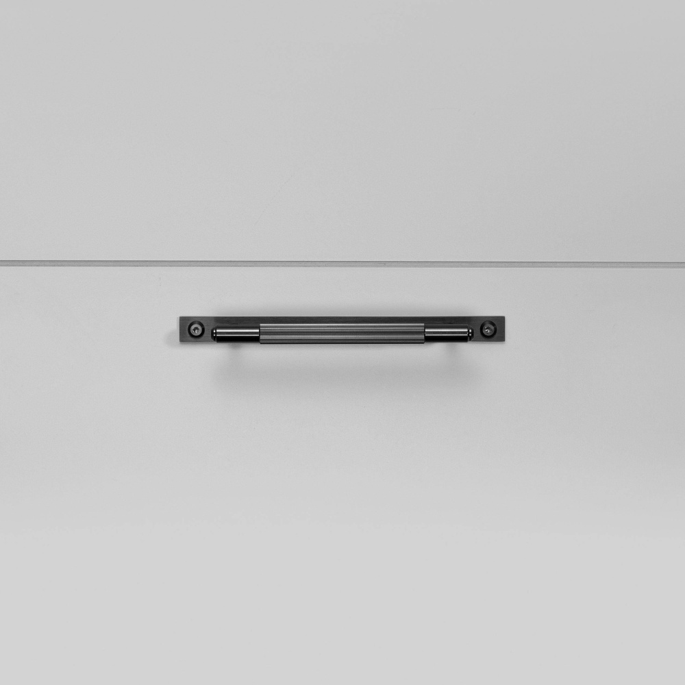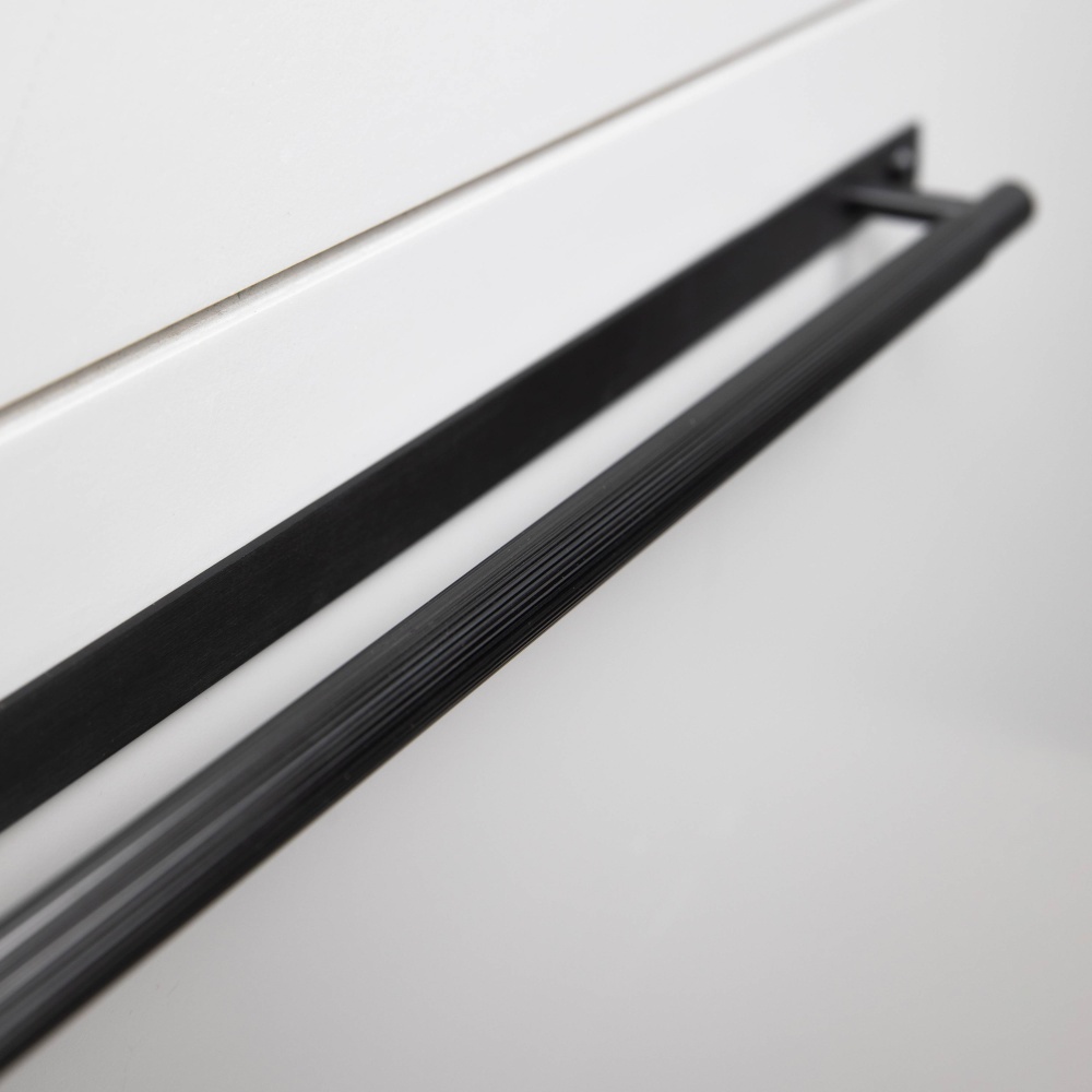 A pull bar made from solid anodised black metal. This pull bar features our signature, diamond-cut, linear-knurl pattern and is refined by hand. The pull bar includes a rectangular backplate made from solid black metal and finished with black metal torx screws. They work great on cabinet doors, wardrobe drawers, cupboards, kitchen units and just about anything that can open.