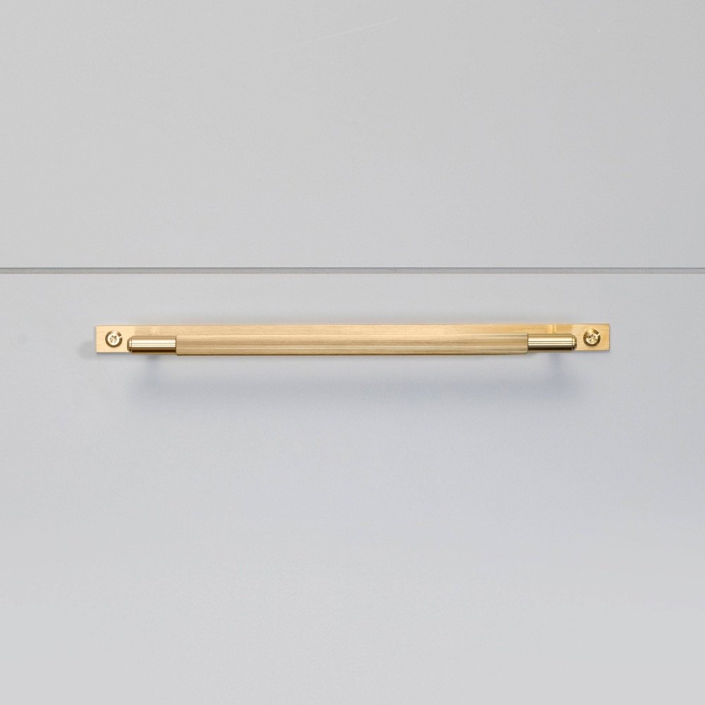 A pull bar made from solid brass. This pull bar features our signature, diamond-cut, linear-knurl pattern and is refined by hand. The pull bar includes a rectangular backplate made from solid brass and finished with brass torx screws. They work great on cabinet doors, wardrobe drawers, cupboards, kitchen units and just about anything that can open.