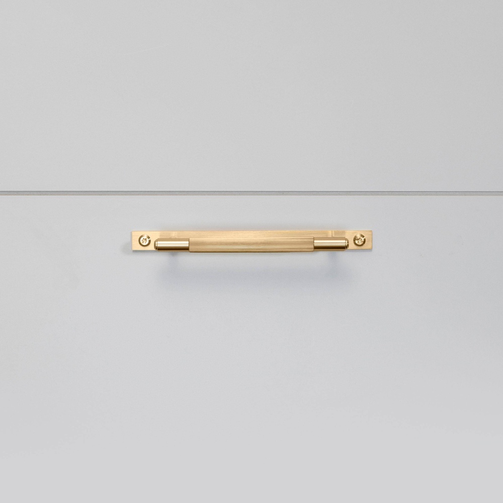 A pull bar made from solid brass. This pull bar features our signature, diamond-cut, linear-knurl pattern and is refined by hand. The pull bar includes a rectangular backplate made from solid brass and finished with brass torx screws. They work great on cabinet doors, wardrobe drawers, cupboards, kitchen units and just about anything that can open.