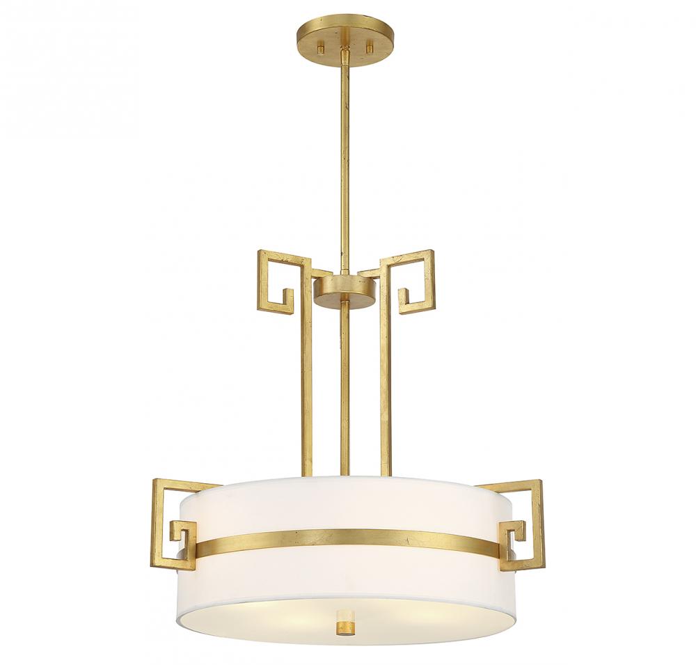 Bring a touch of Mediterranean magic to any space with the Savoy House Quatrain 4-light pendant! It showcases Greek key detail, a white fabric drum shade and a beautifully textured True Gold finish that recalls gold leaf. Quatrain is 22.75" in width and has an adjustable height ranging from 20.5" to 74". Comes with four 12" downrods and one 6" downrod. Uses 4 standard size bulbs with a max of 60 watts per bulb (bulbs not included).
