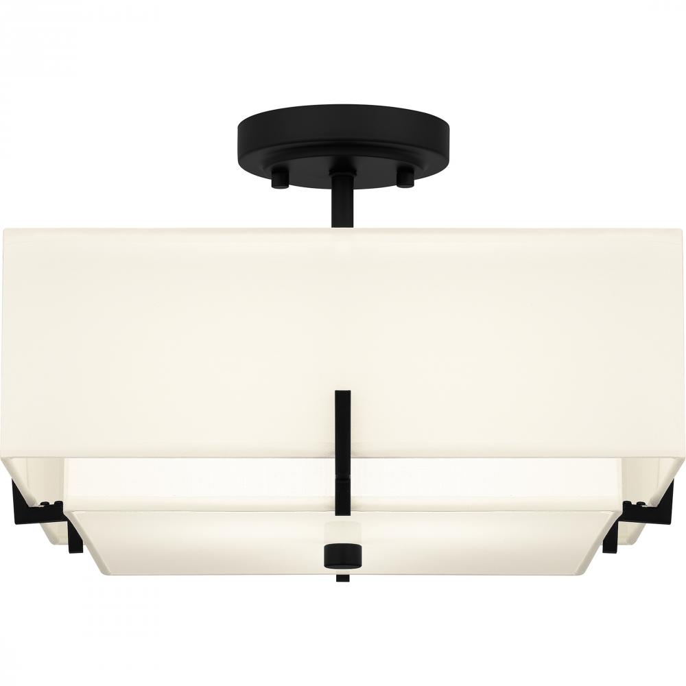 Cast a warm glow with the Renzo semi-flush mount. A square beige fabric shade surrounds a smaller shade for a unique, layered look. A matte black finish and matching geometric accents add to the transitional feel, making Renzo a perfect choice in any hallw