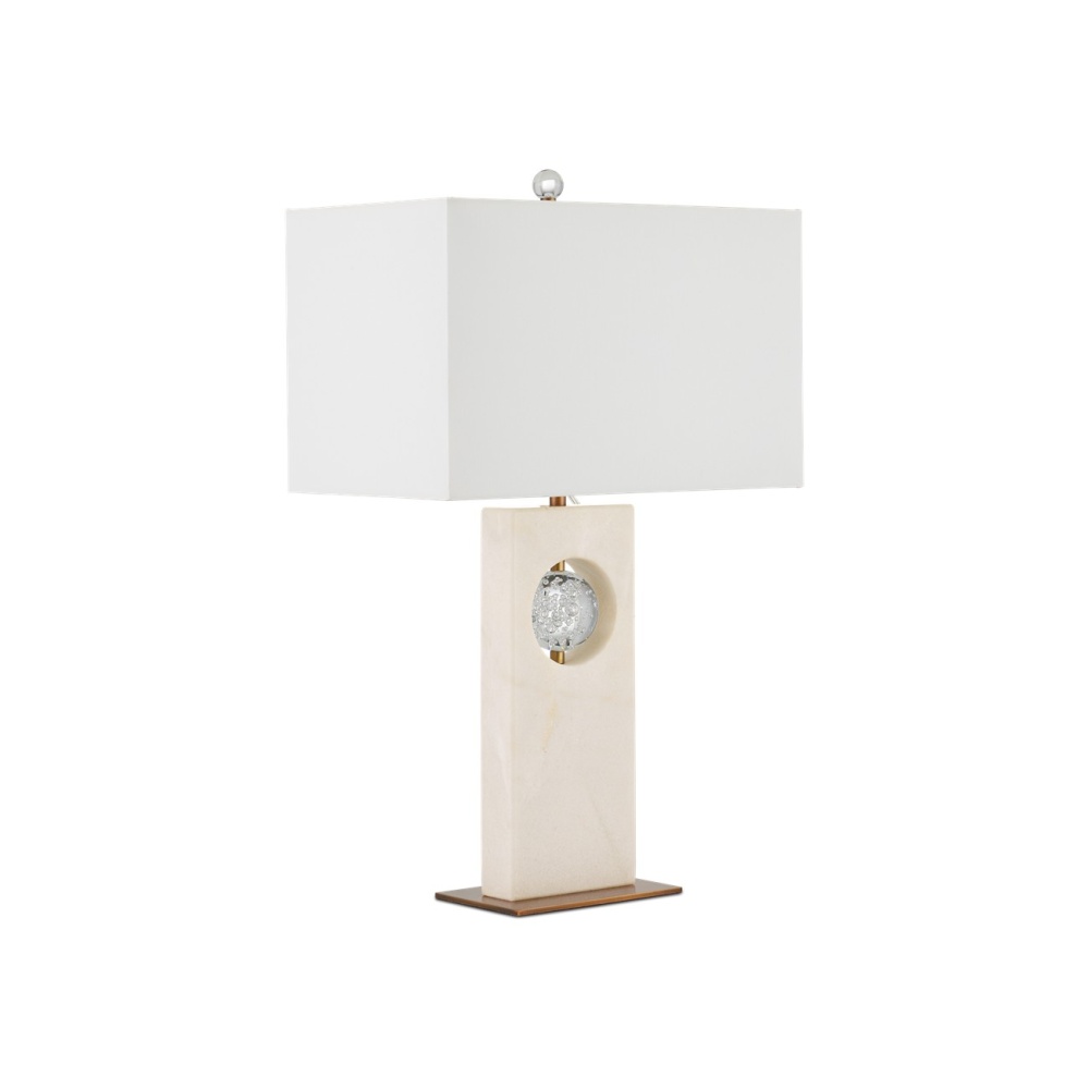 The Radiant Table Lamp has a sophisticated profile made of a glamorous mix of materials. The tall rectangular body, which is made of white marble, has a circular cut-out into which a bubbled optic-crystal orb is fastened. The rods that affix the globe and disappear under the shade are seamless in size and match the antique brass finish on the minimal base. The rectangular shade is perfectly scaled to the shape of the body of the white lamp.