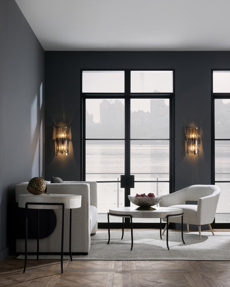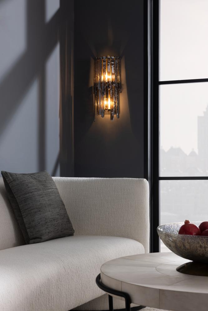 OUR RAINE SCONCE WAS INSPIRED BY THE VINTAGE MURANO GLASS LIGHTING MADE POPULAR IN THE ’60S AND ’70S. THE CASCADING SILHOUETTE IS EMBELLISHED WITH HALF-ROUND LAYERS OF BLUE SMOKE LUSTER SEEDY GLASS IN STAGGERED SIZES. THE LUSTROUS GLASS PIECES FOLD OVER A TIERED IRON FRAME, WHICH IS FINISHED IN ANTIQUE BRASS. THE RESULT IS A DRAMATIC AND TEXTURAL WATERFALL EFFECT. THE GLASS STRIPS CAN BE REMOVED TO PROVIDE ADDITIONAL ILLUMINATION IF DESIRED. FINISH WILL VARY. DAMP-RATED, ALTHOUGH LIMITED COVERED OUTDOOR CONDITIONS MAY AFFECT FINISH.