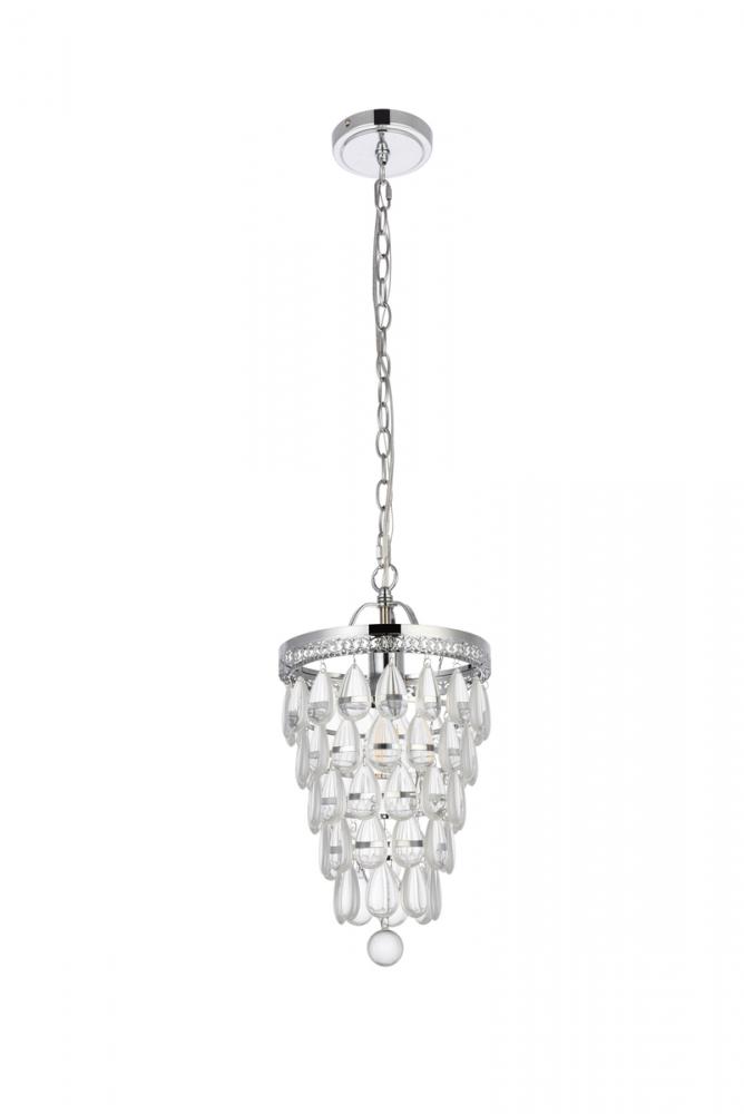 This one light pendant is sure to look great in your space. The circular canopy, hanging chain, and socket are made from metal of your choice of finish. It features a cascading tiers of crystal drops that encases one medium socket. This fixture takes one 40W bulb, (not included) that wash your space in a bright glow. It's compatible with a dimmer switch, so you'll always have the right amount of light no matter the time of day.