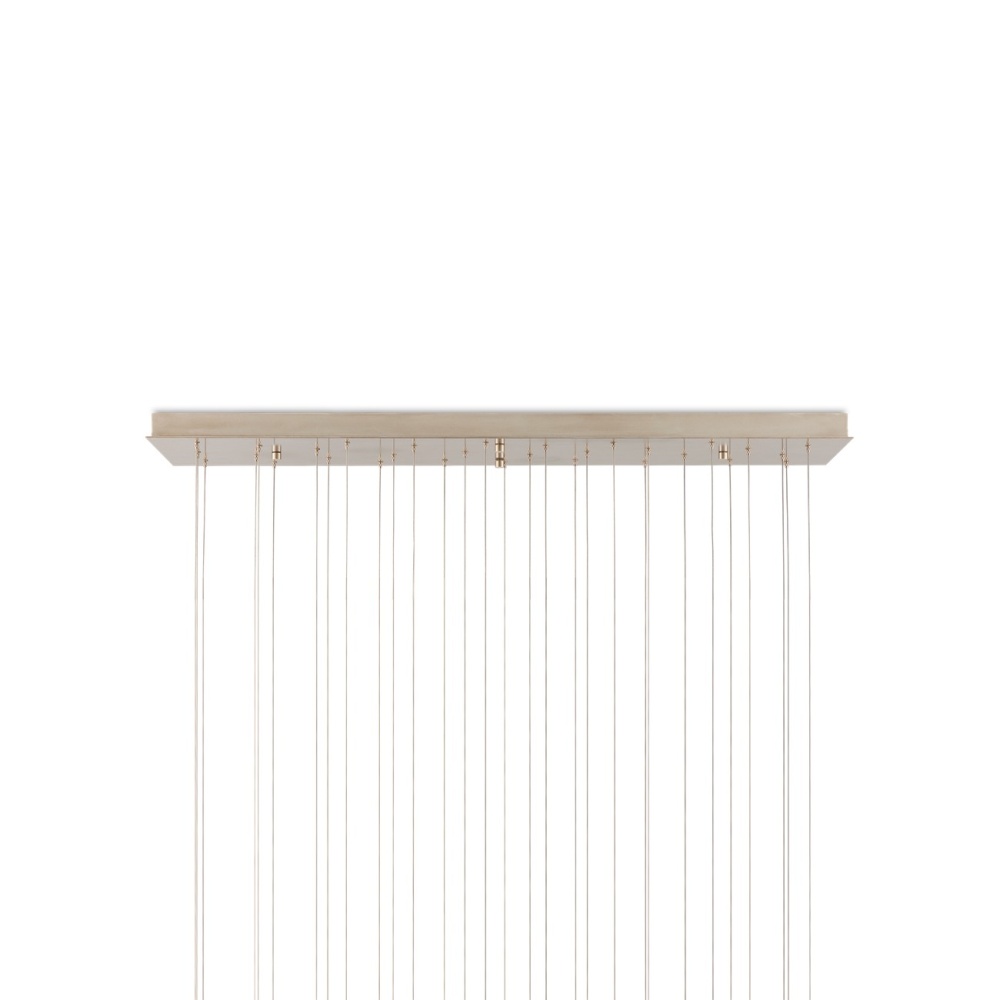 Natural Capiz shell and wrought iron in a Cupertino finish create a luminous circular pattern on the shades of the Regatta 30-Light Multi-Drop Pendant. Each cylindrical element has such a pleasing glow when light shines through the lustrous natural material. There is great artistry in achieving such a complex pattern, as each slice of shell has to be surrounded in metal and soldered into a frame once the metal circles are joined to each other. The canopy of this piece is luminous in a painted silver finish. This fixture is among Currey & Company's multi-drop pendant collection, which includes multiple configurations.