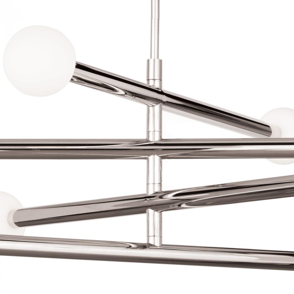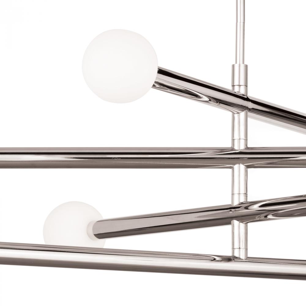 Four arms swivel around a center point on our modern, linear Beaubien Chandelier. Create a unique, dynamic design in your modern loft, entryway, or over a dining table. Beaubien's white glass, globe bulb covers add the perfect amount of diffused light to your space.