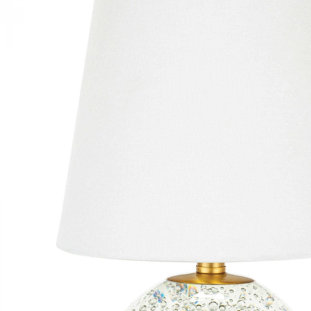A classic spherical silhouette has an alluring surprise element. Organic bubbles are suspended within the clear crystal body of the Bulle Mini Lamp. Simple, elegant detailing completes the piece in the form of a gilded neck and ball finial that sits atop a crisp, tapered natural linen shade. The Bulle is the perfect lamp for a bedside table, small end table or to give illumination to a shelf or display.