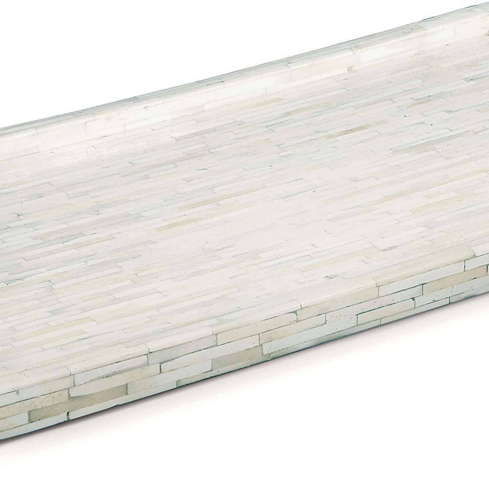 Adding luxury and style to your bedroom, living, or entertainment space, this rectangular tray is covered in hand-inlay natural bone with a mosaic pattern that creates a rich composite for staging objets d'art to personal accessories. Polished nickel handles make it easy to re-position and transport the tray while adding a visually appealing element.
