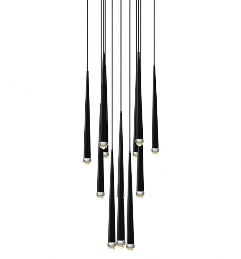 A modern cascading LED pendant offered in a Matte Black Finish and a Chrome finish. This collection has a contemporary feel with added interest in the detailed glass shade. Both finishes have a black fabric cord to complete the style.