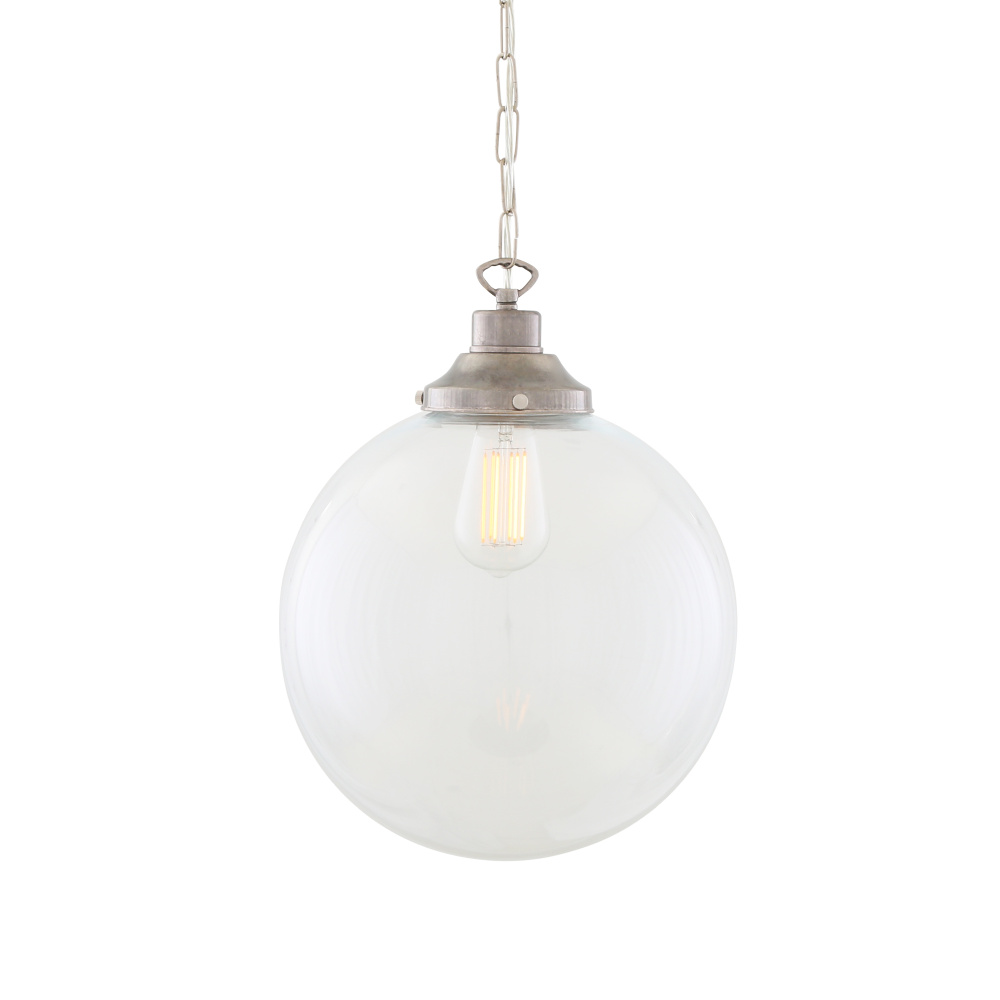 Evoking early 20th-century industrial lighting, the Riad 11.75íí Clear Globe Pendant captures the timeless appeal of classic designs with its exposed hardware and clean lines. This globe pendant offers a simple yet stylish modern industrial look, ideal for kitchens, bars, or restaurants. Suspended from a straightforward chain, it works beautifully as a single pendant over a desk or kitchen workspace, or grouped in clusters for a striking contemporary effect. Perfect for minimalist or industrial interiors, this glass pendant truly shines when paired with an Edison squirrel cage bulb, casting a soft, inviting glow.