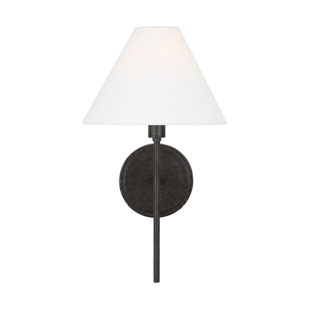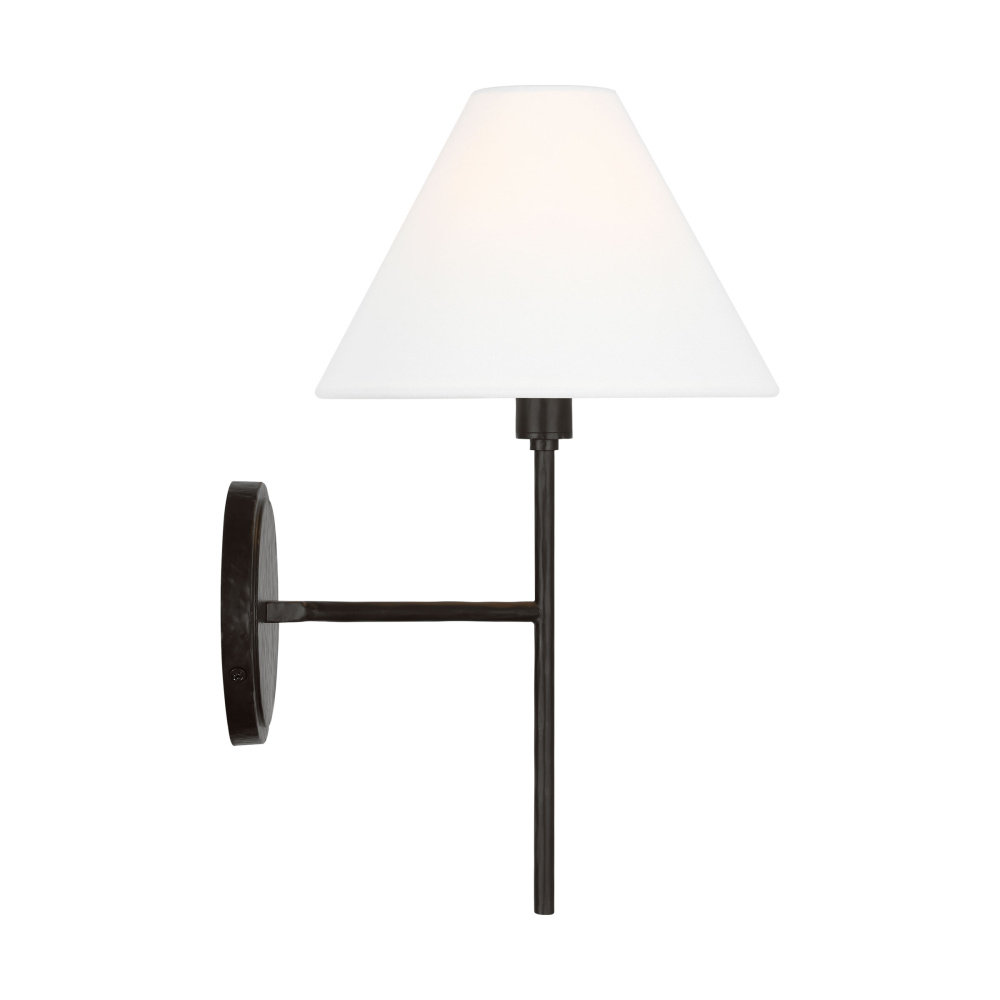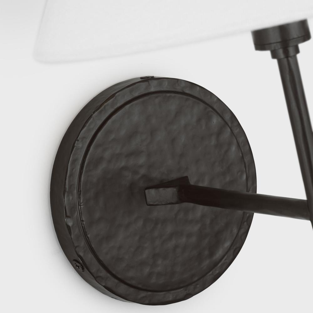 Crafted with Steel in a Aged Iron finish with white linen fabric shade