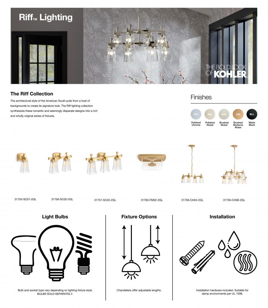 Inspired by the French and Spanish architecture of the historical American South, Riff collection lighting offers a contemporary interpretation of traditional Southern design. Distinct with square lines and bell-shaped shades, the collection's sconces, flush-mounts, and chandeliers will enrich your home decor with a timeless yet modern feel. The perfect blend of high style and thoughtful functionality, these lighting fixtures were designed to coordinate with the KOHLER Riff faucet collection.