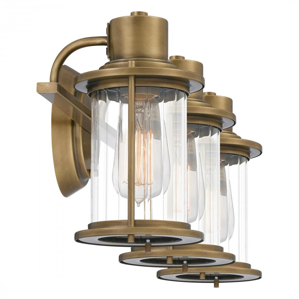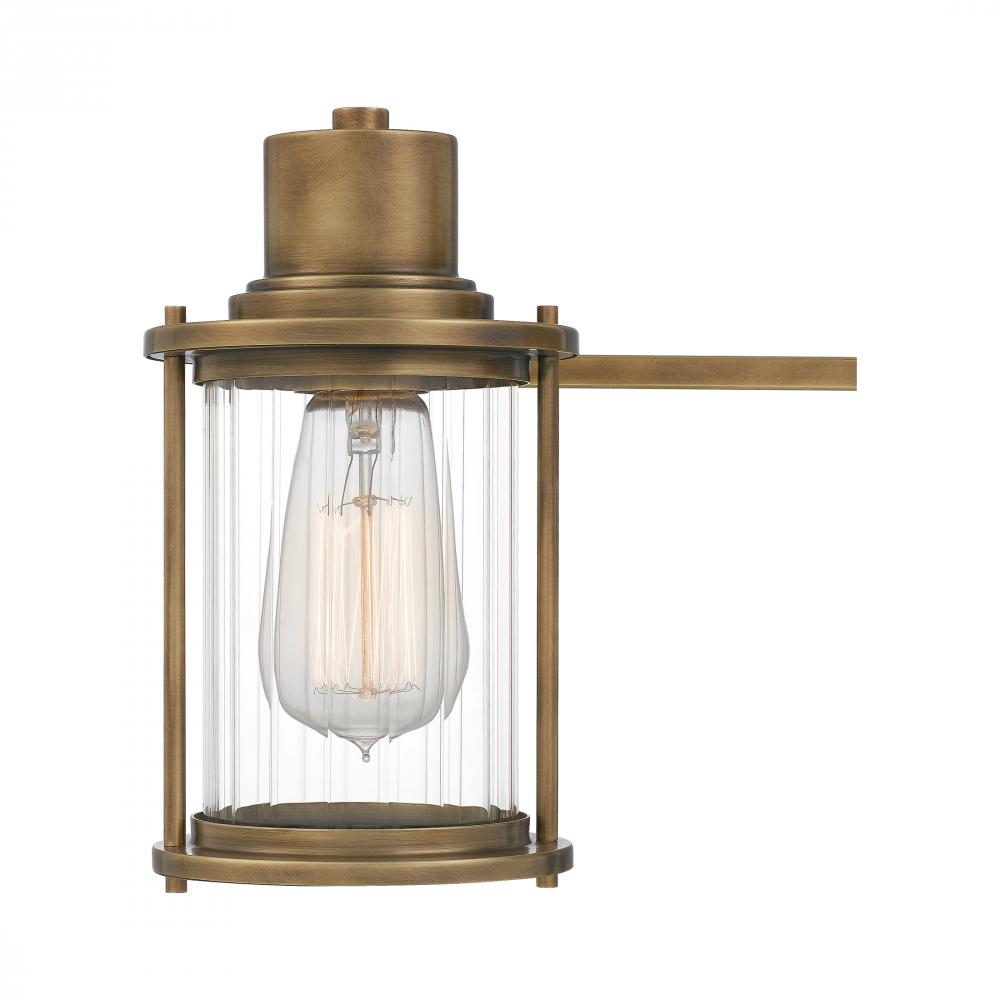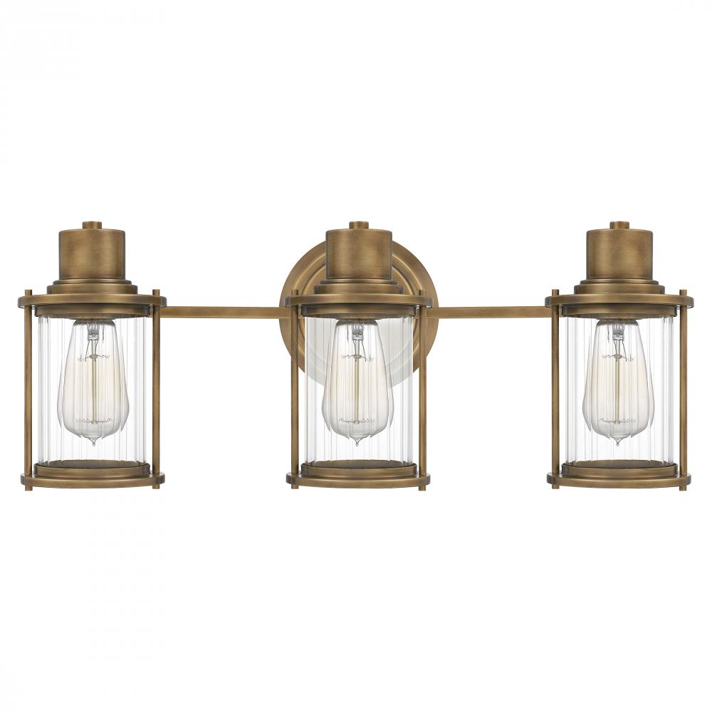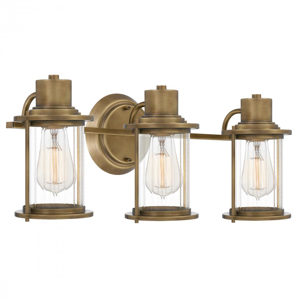 The Riggs collection gives a nod to nautical design with classic New England elements. The Weathered Brass finish compliments the silhouette which is reminiscent of vintage lanterns. The clear, ribbed glass shades provide a relaxing glow throughout your ba