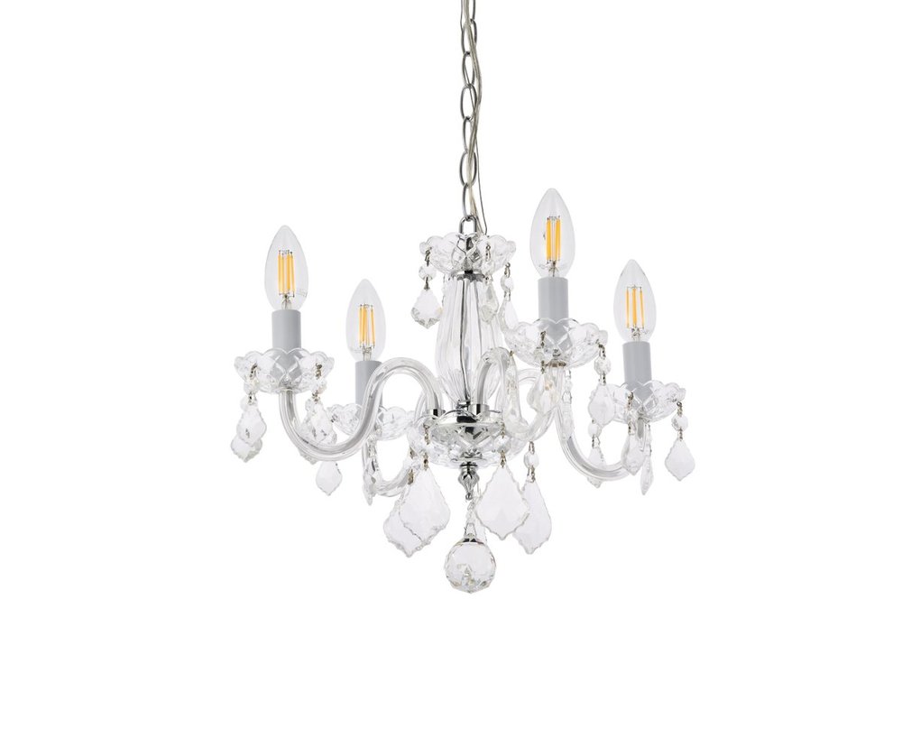 Steel frame with chrome finish is highlighted by curved glass arms, a glass vase, and glass holders for the 4 candelabra bulbs