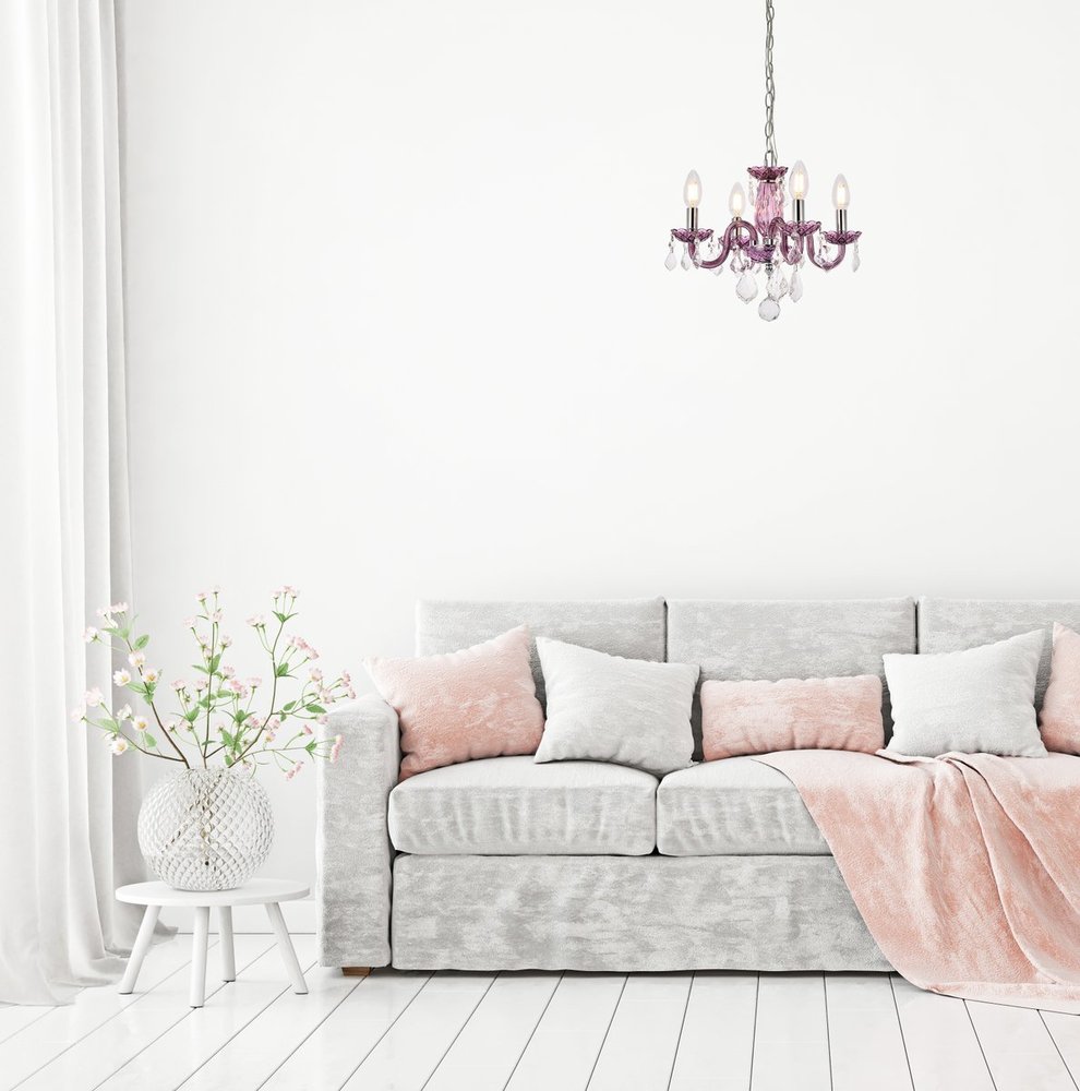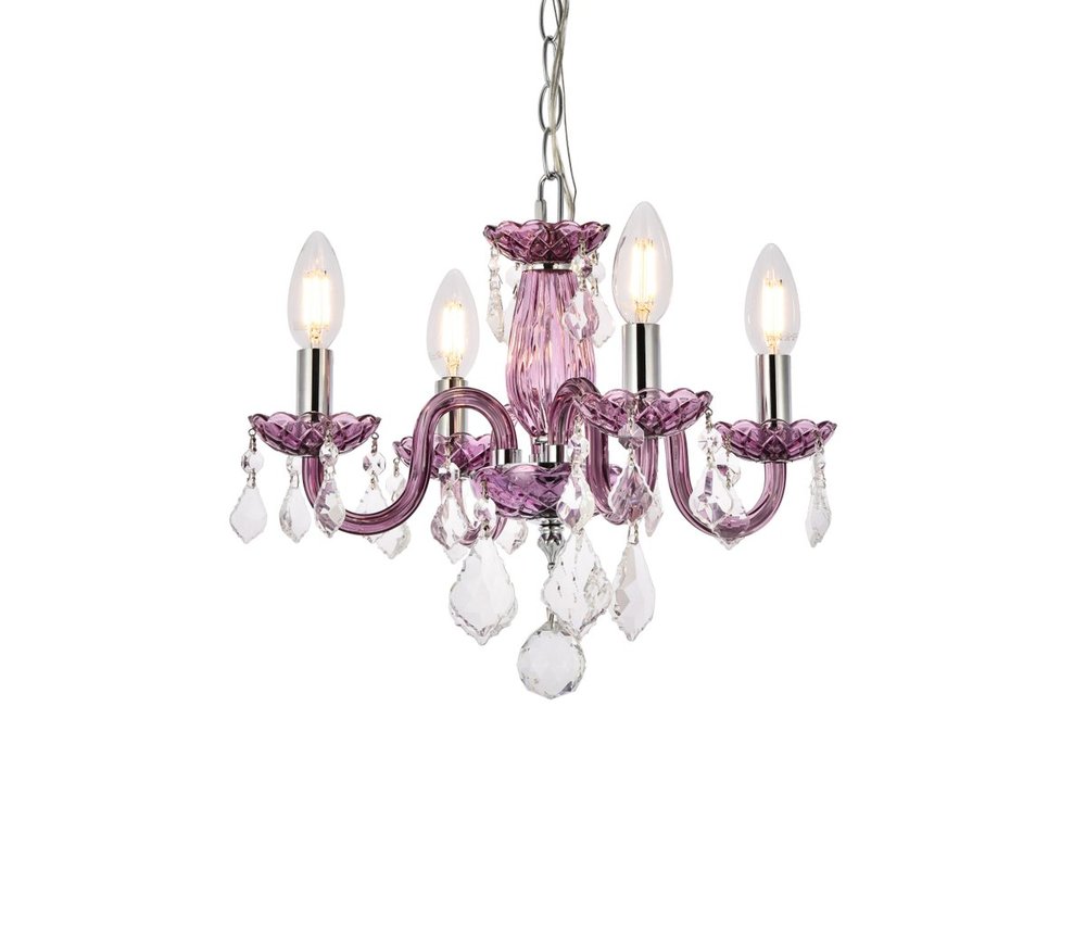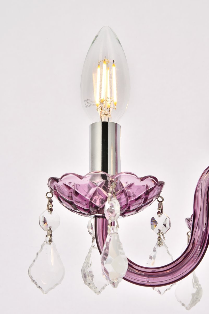 Steel frame with purple finish is highlighted by curved glass arms, a glass vase, and glass holders for the 4 candelabra bulbs